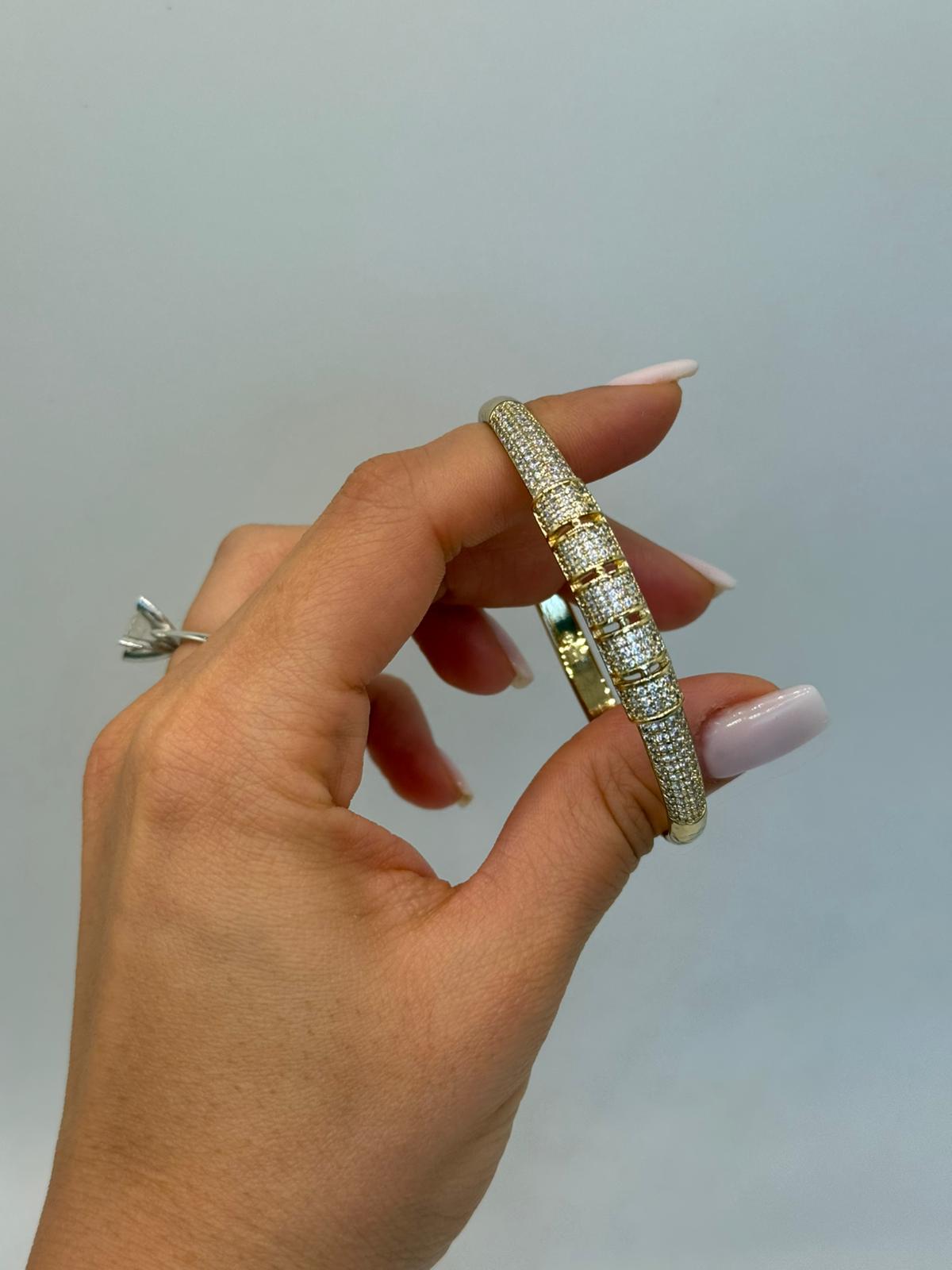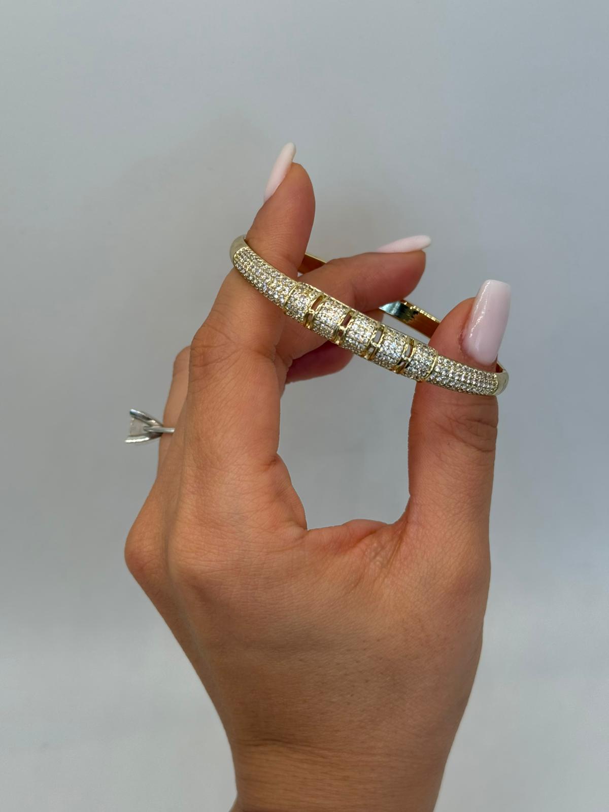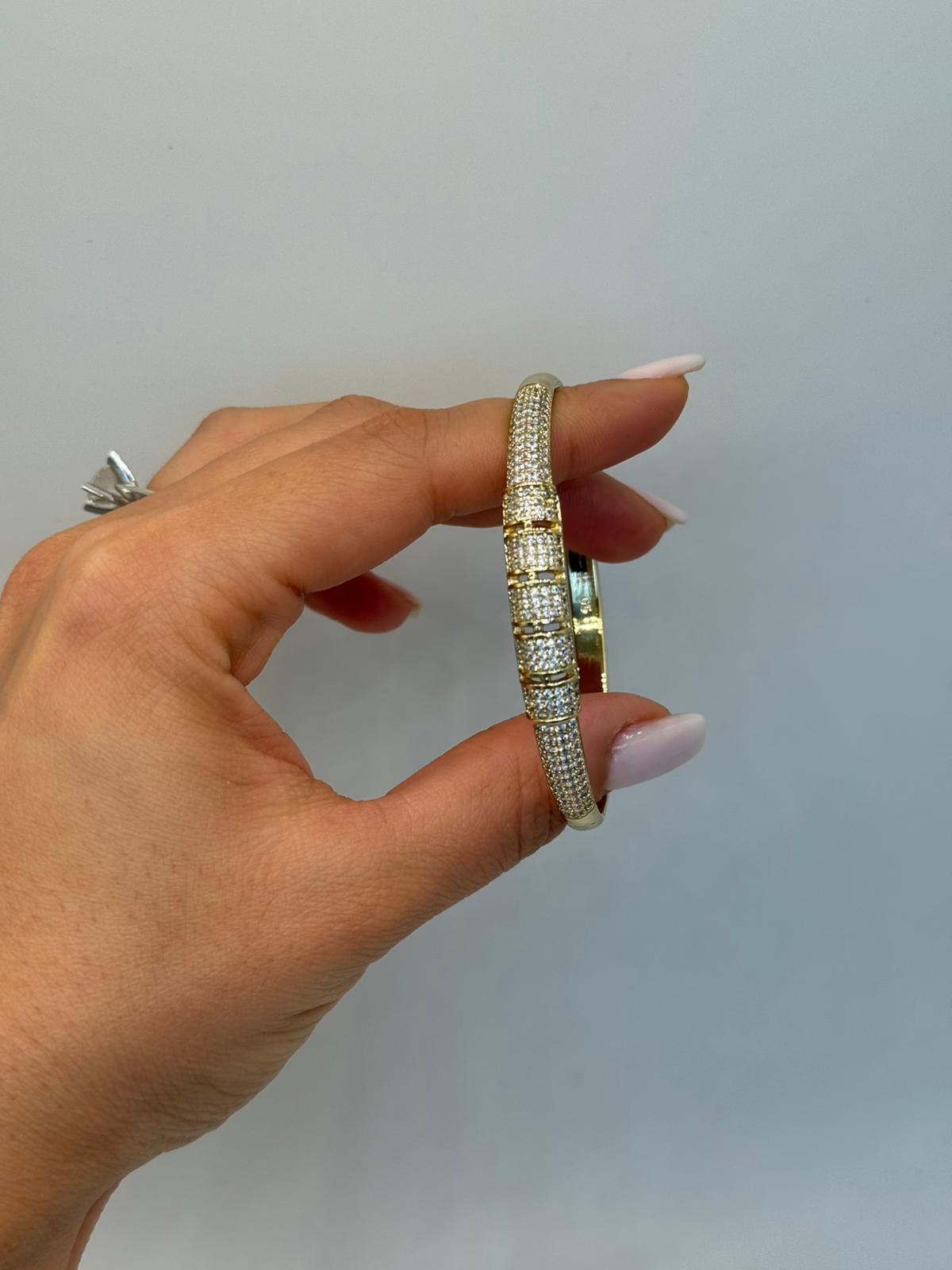 Modern çizgilerle tasarlanmış bu kelepçe bileklik, tamamı ışıltılı taş kaplaması ve geometrik ara detaylarıyla dikkat çeker. Zarif formu sayesinde bilekte son derece şık durur. Tek başına güçlü bir stil yaratır, özel gün kombinlerine sofistike bir dokunuş katar.