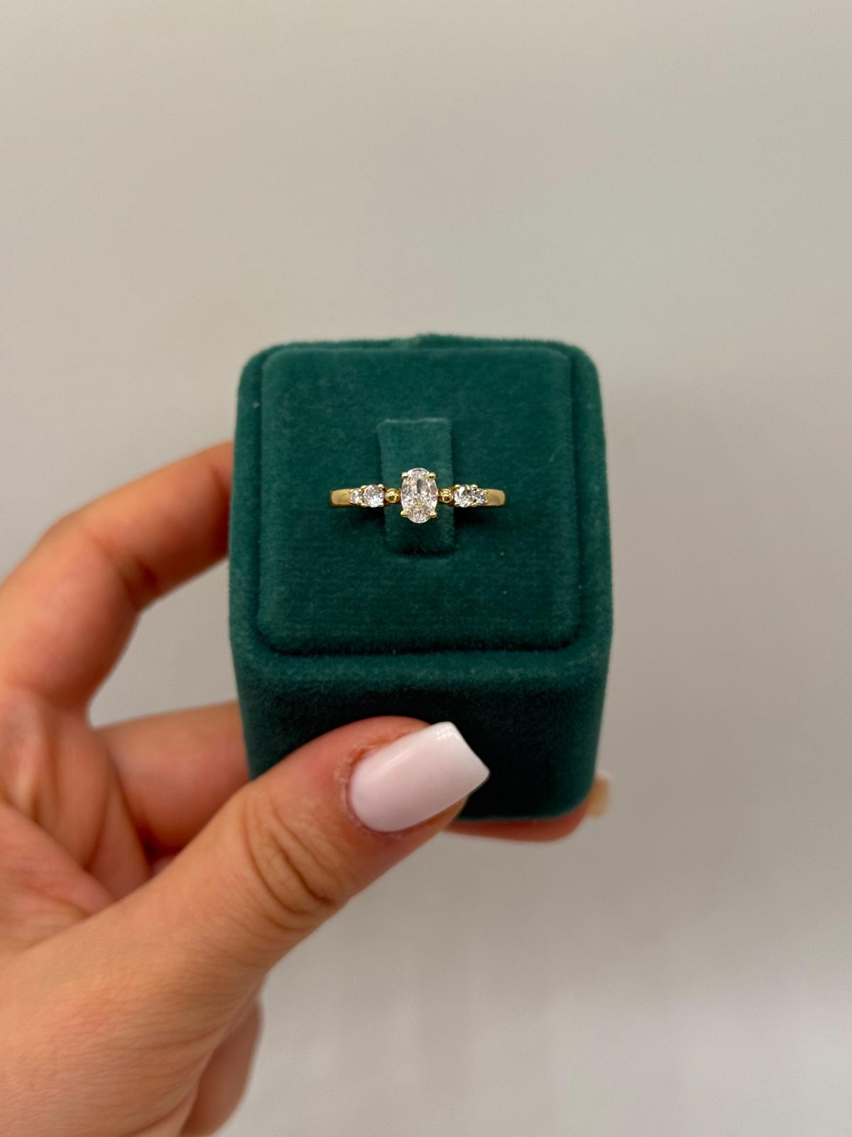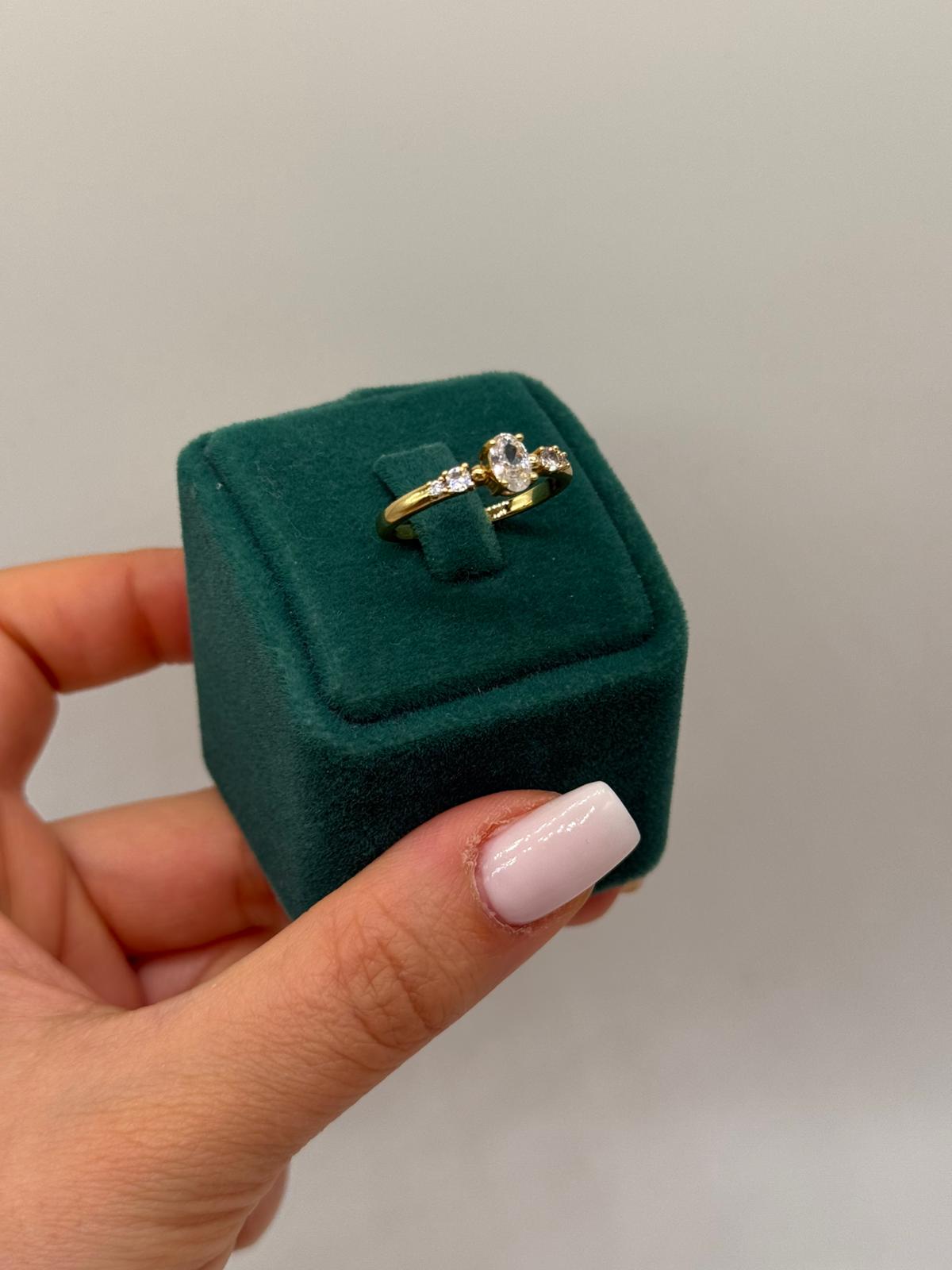 Klasik tek taş tasarımından ilham alan bu yüzük, merkezdeki ışıltılı taşı ve yanlardaki zarif taş detaylarıyla sade bir şıklık sunar. İnce formu sayesinde parmakta son derece zarif durur ve her kombine kolayca uyum sağlar.