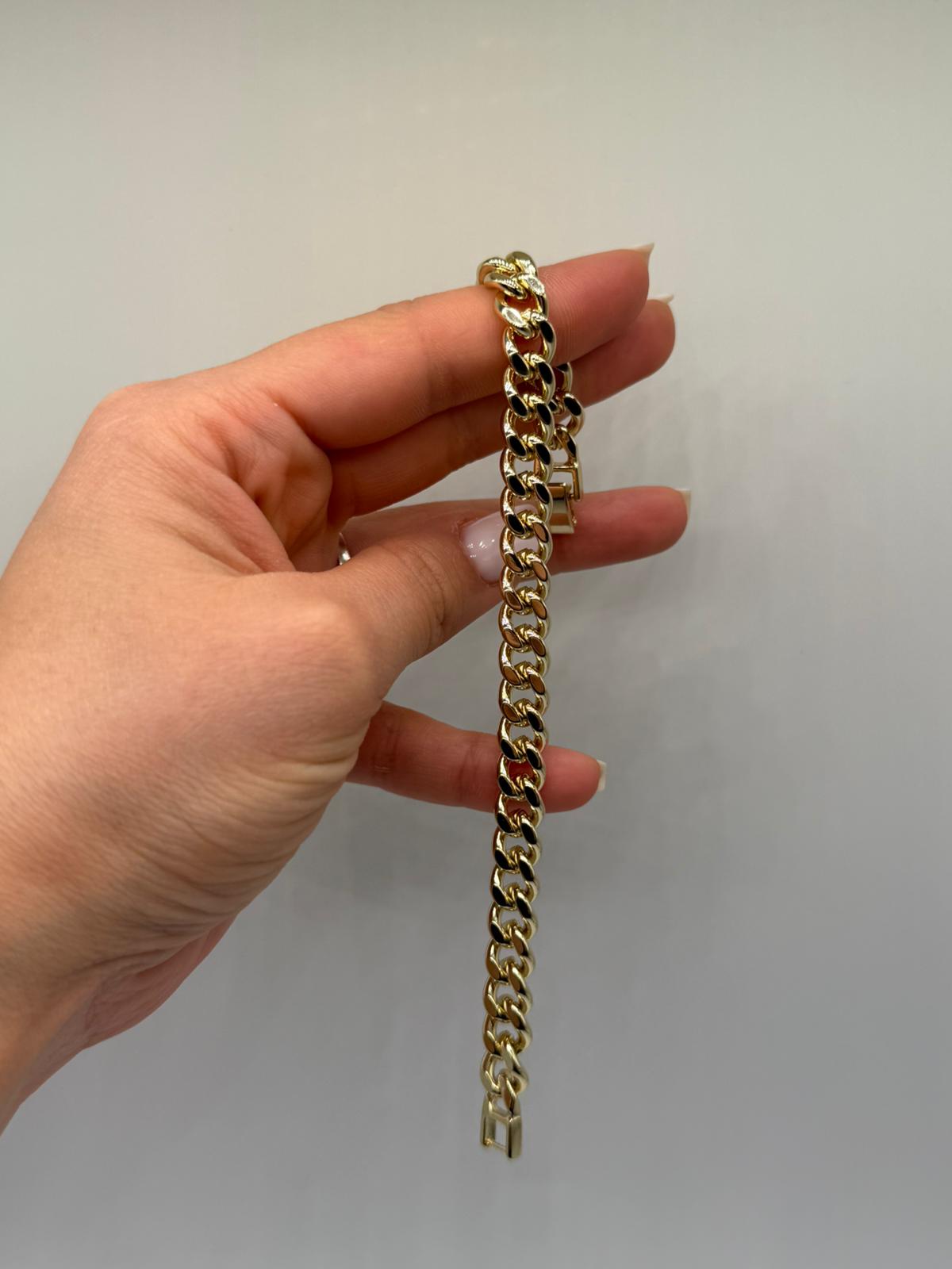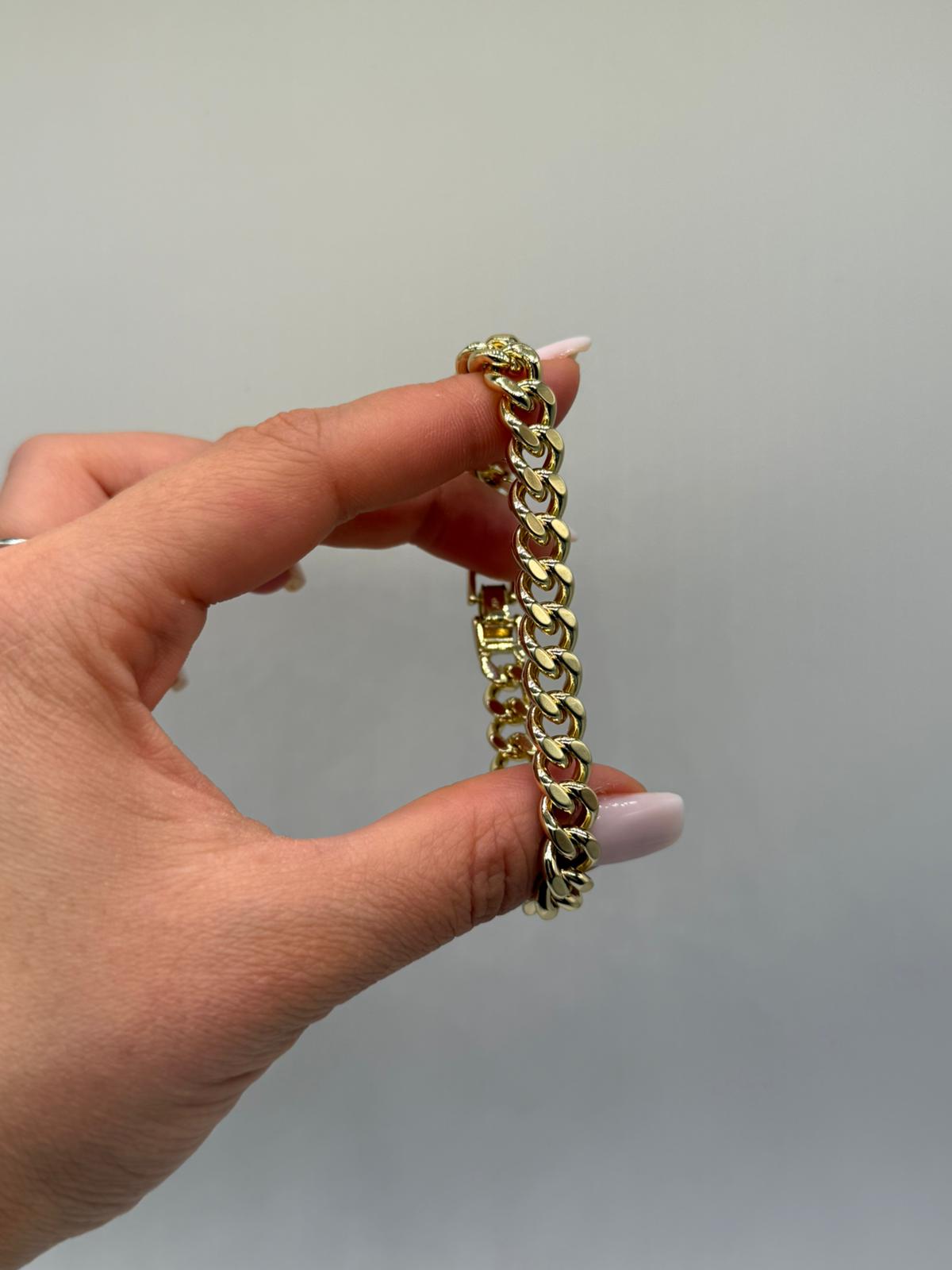 Klasik Cuban Gold VIP Çelik Bileklik, parlak gold kaplaması ve sık dokulu zincir yapısıyla zamansız bir şıklık sunar. Dengeli kalınlıktaki Cuban zincir formu, bilekte hem güçlü hem de sade bir görünüm oluşturur.