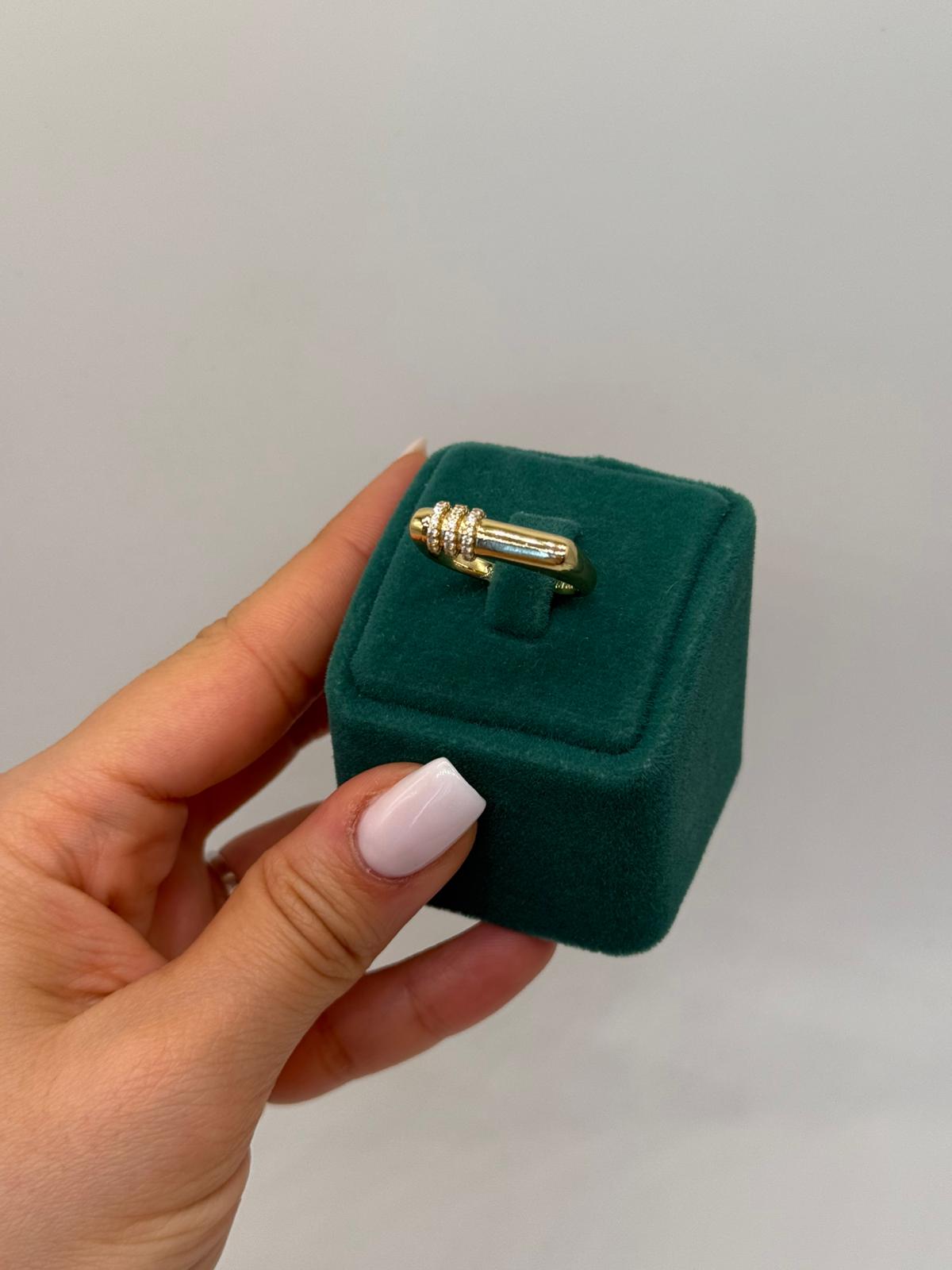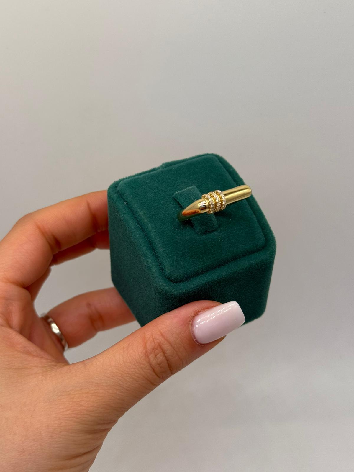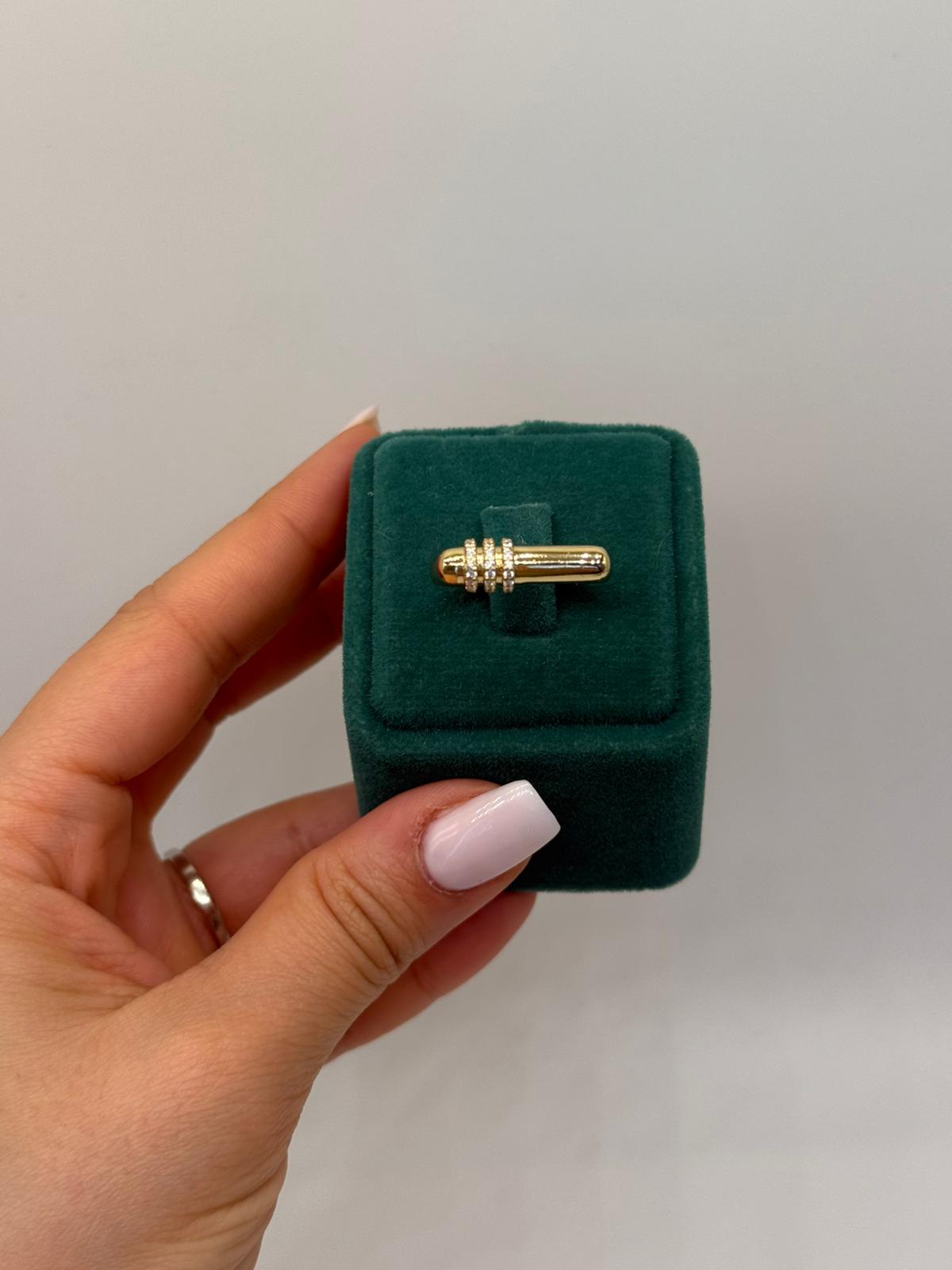 Linea Minimal Yüzük, yalın çizgilerin zamansız şıklığını yansıtan modern bir tasarıma sahiptir. Silindirik formdaki altın kaplama gövde, merkezde yer alan ince taş detaylarıyla dengeli ve sofistike bir görünüm sunar. Minimal ama karakterli yapısıyla stil sahibi kombinlerin tamamlayıcı parçasıdır.