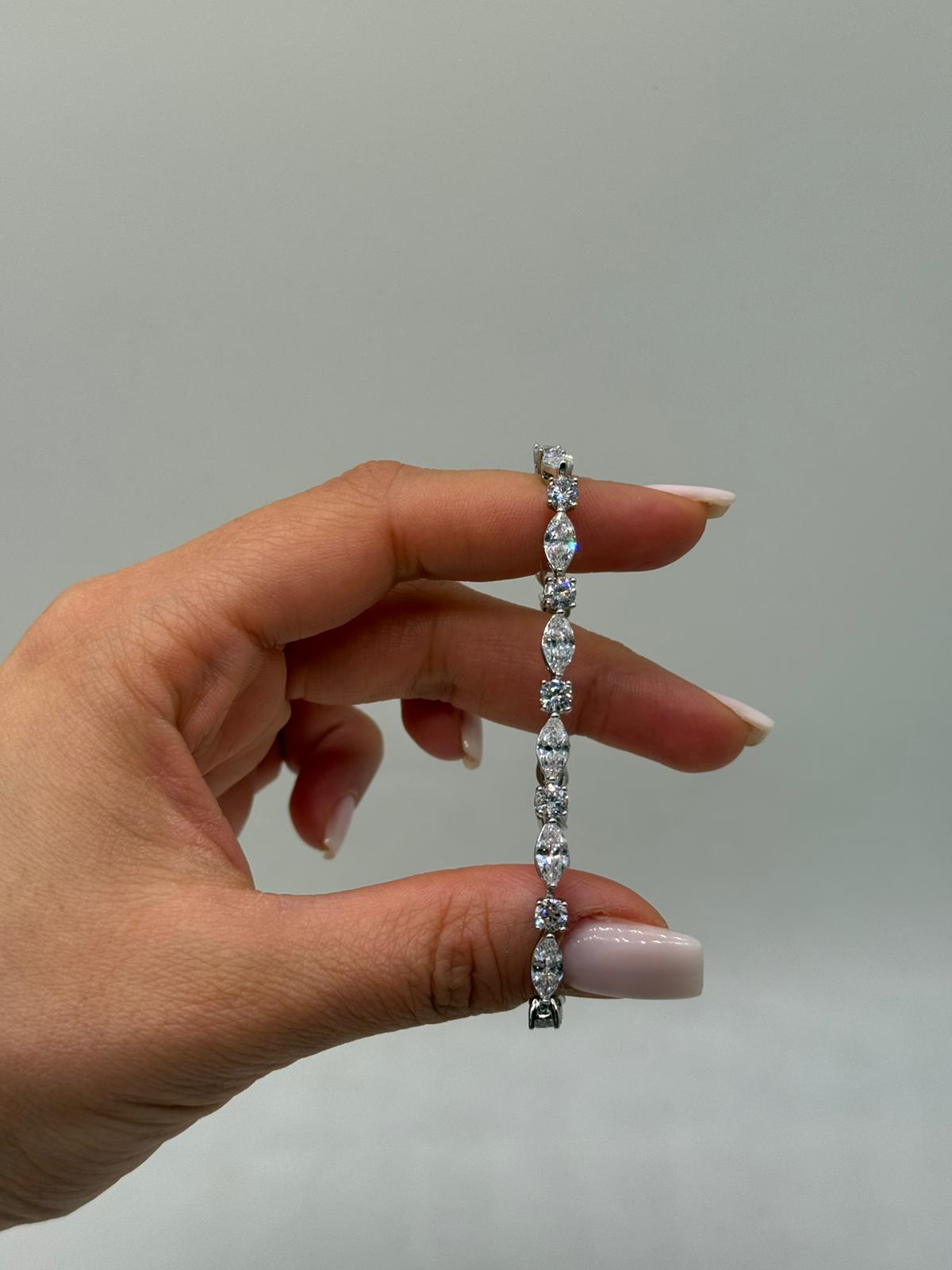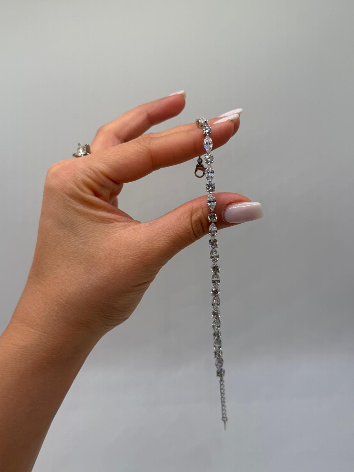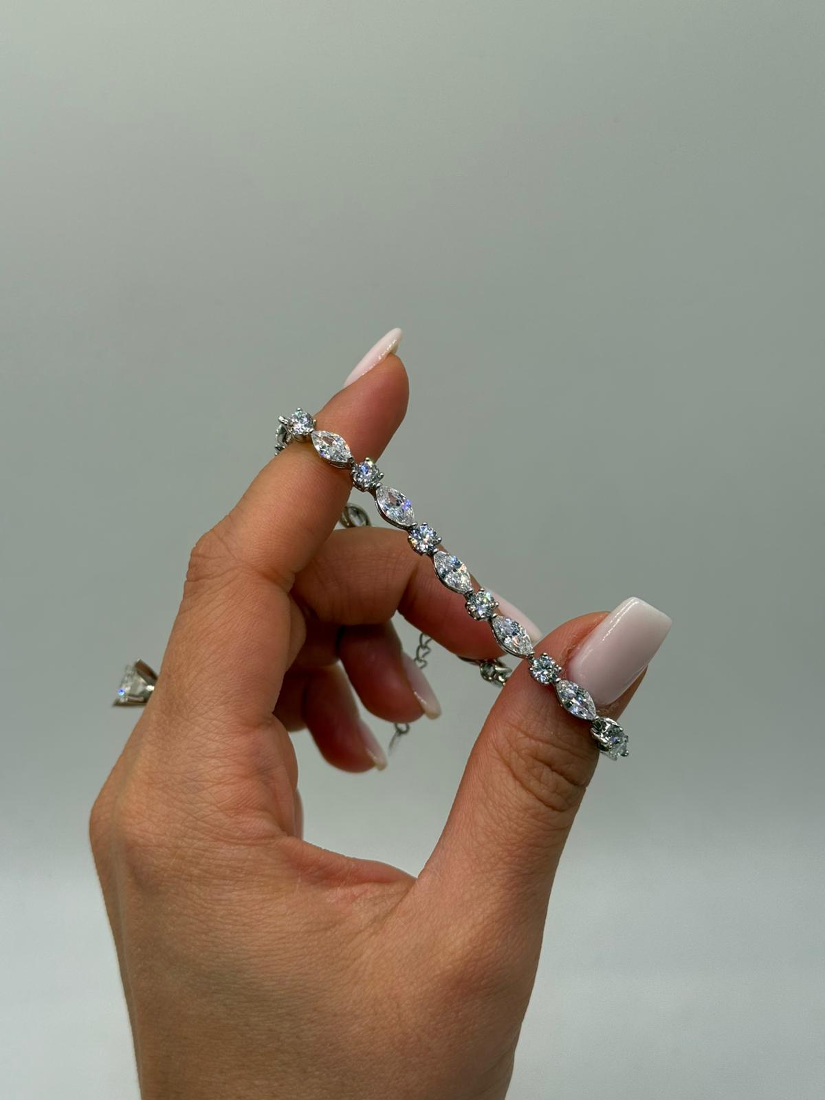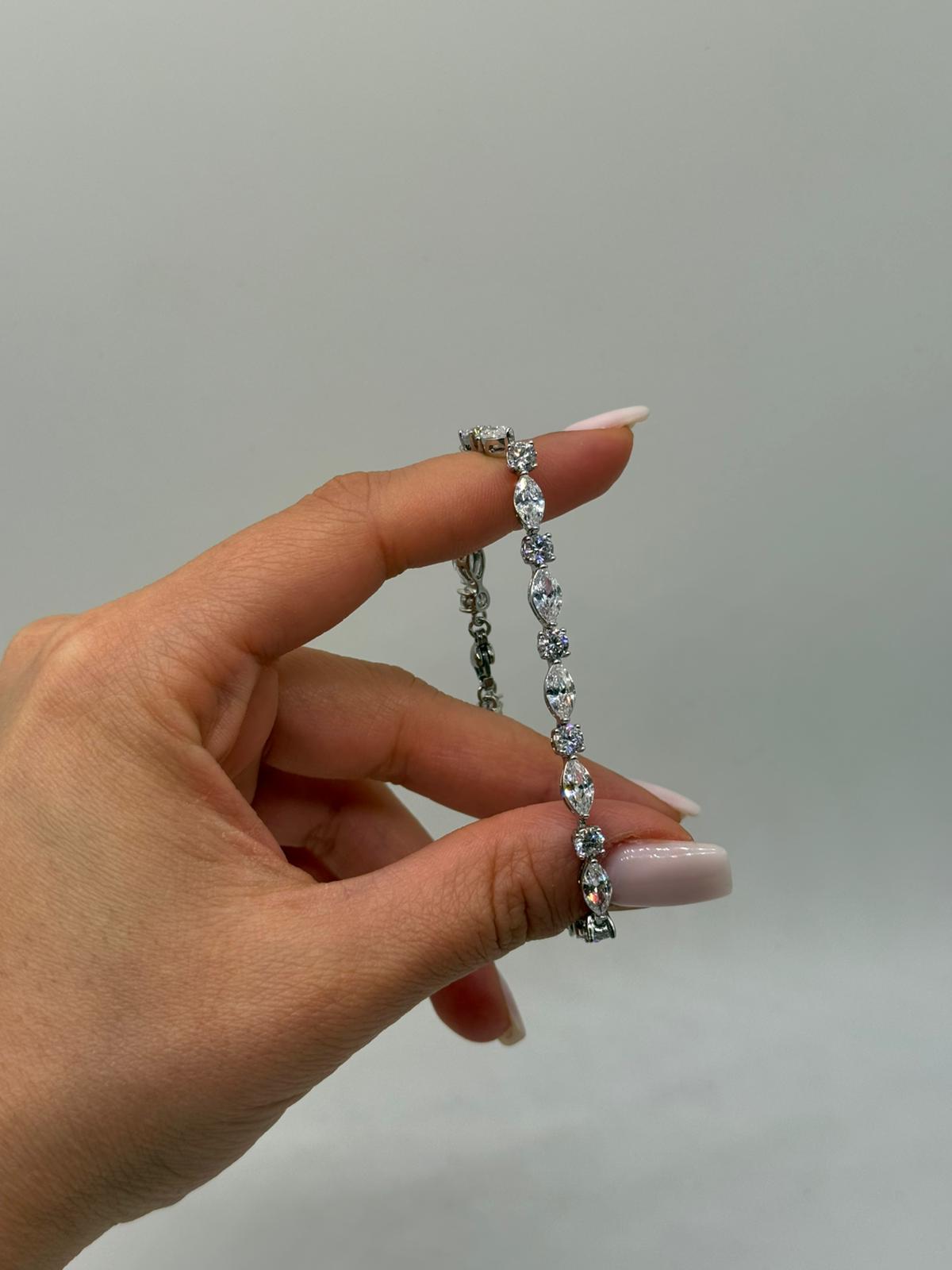 Marquise (yaprak) kesim ve yuvarlak zirkon taşların dönüşümlü dizilimiyle tasarlanan bu VIP çelik bileklik, feminen ve sofistike bir duruş sunar. Taşların dengeli yerleşimi sayesinde bilekte ince, zarif ve ışık oyunlarıyla dikkat çeken bir görünüm oluşturur.
