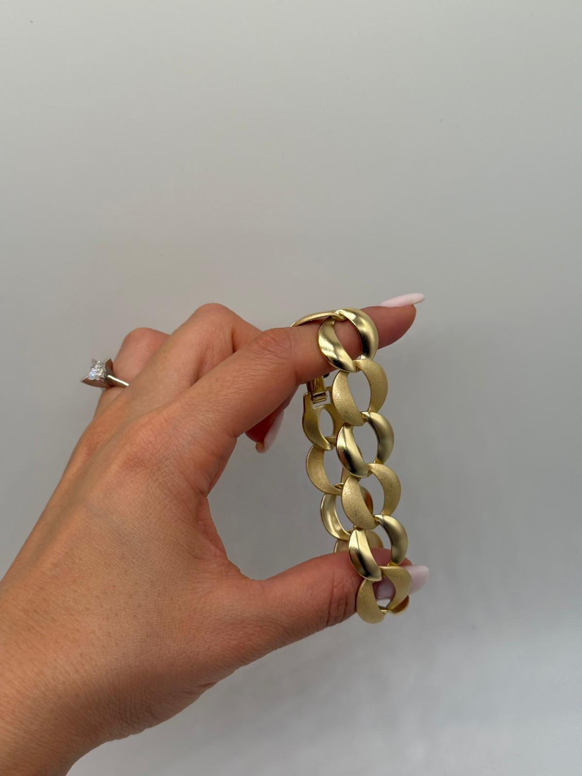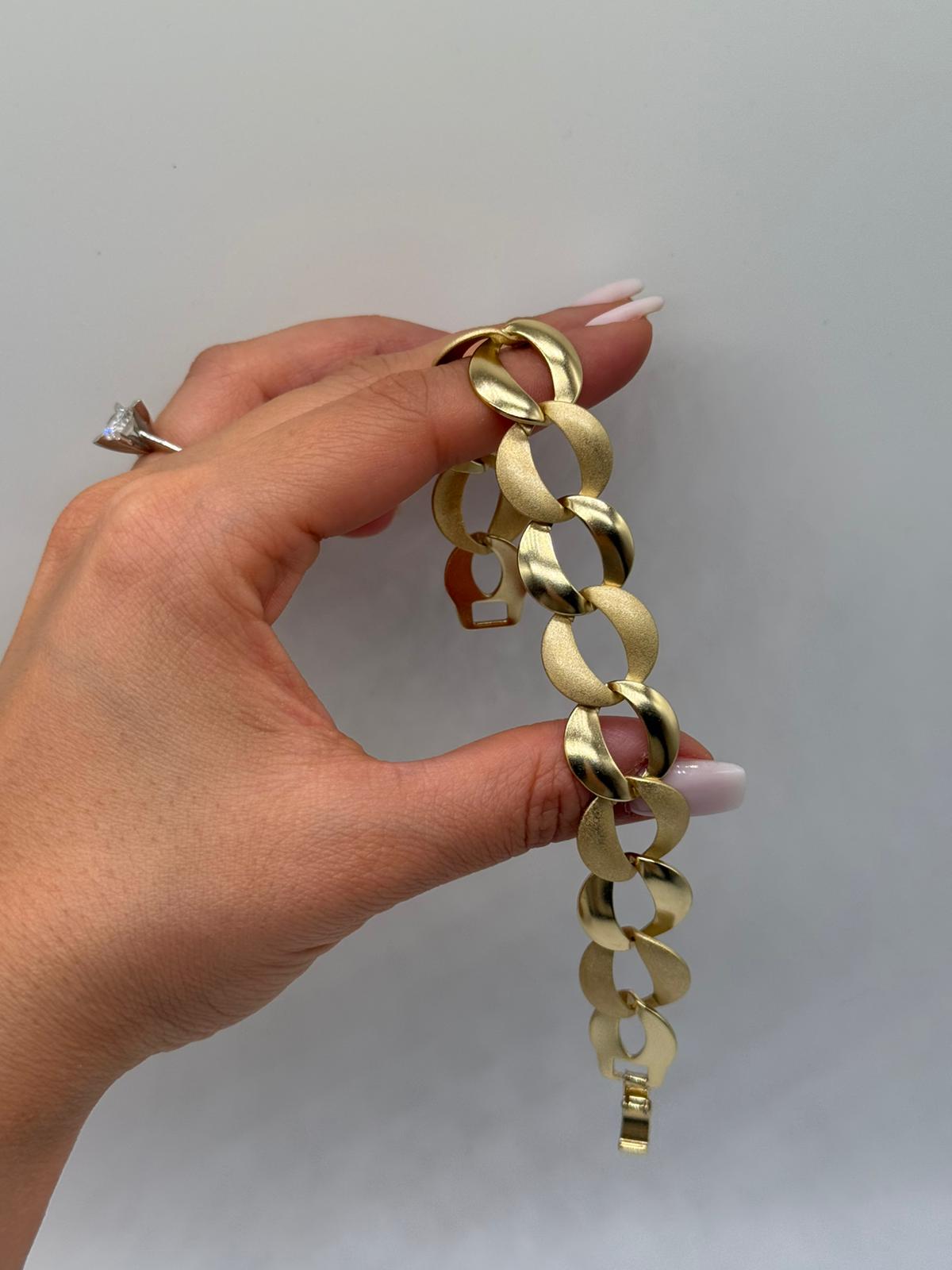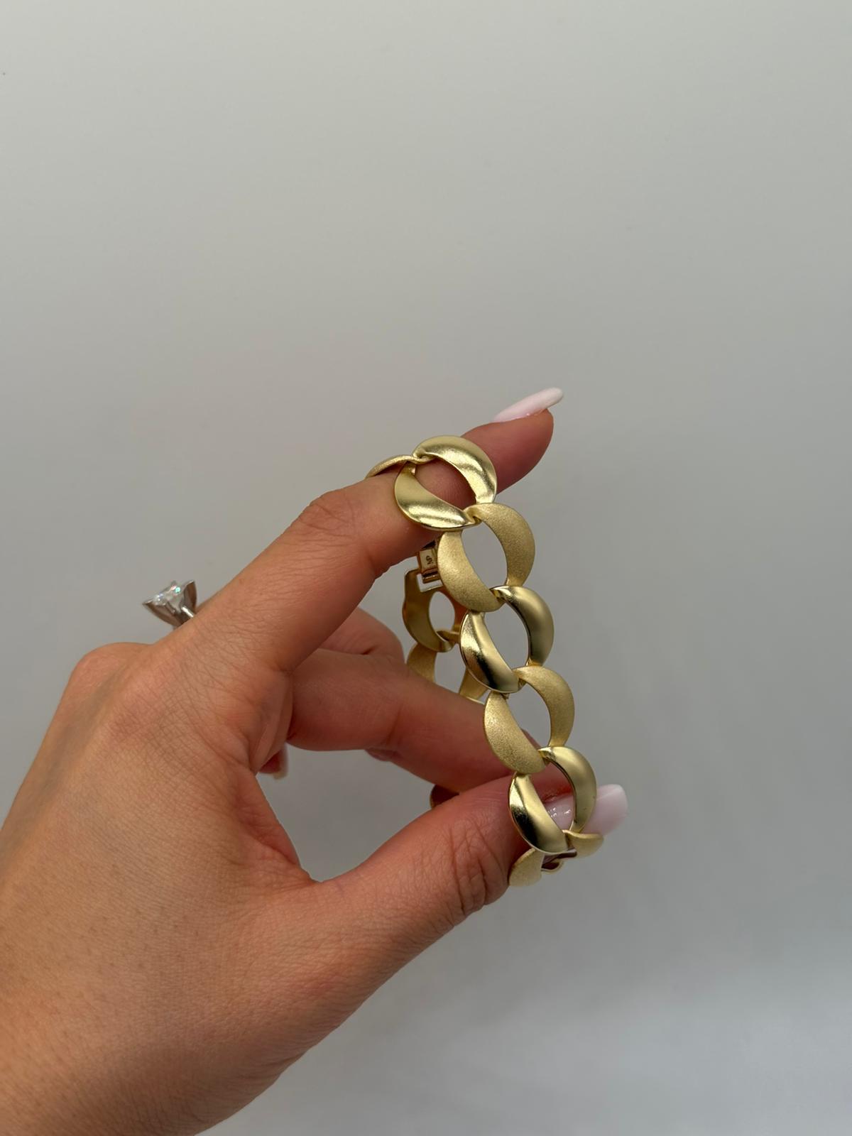 Xuping halkalı zincir bileklik, mat ve parlak yüzeylerin uyumuyla modern ve güçlü bir stil sunar. Büyük halka formu sayesinde bilekte dikkat çekici bir duruş sergiler. Altın renk kaplaması, tasarıma sofistike bir hava katarken hem günlük kombinlerde hem de özel davetlerde şıklığınızı tamamlar.