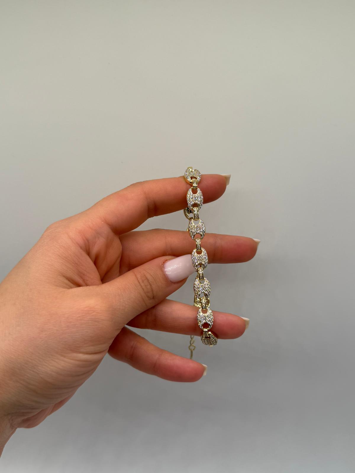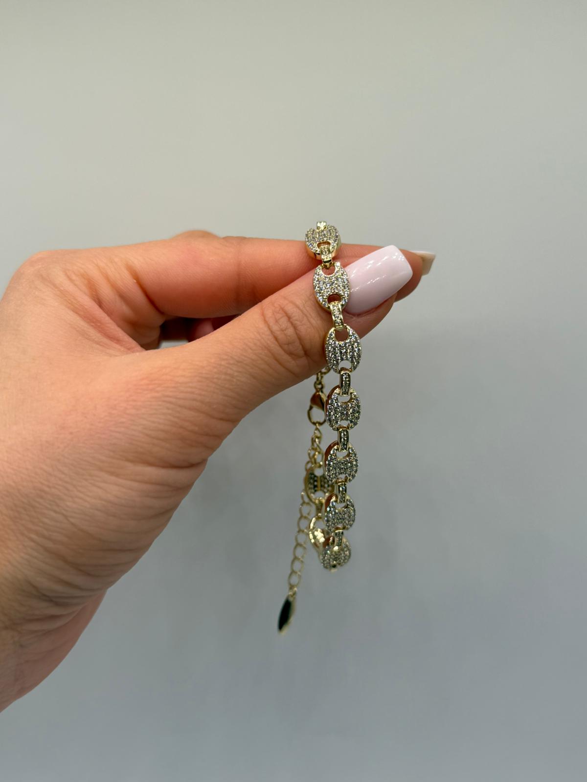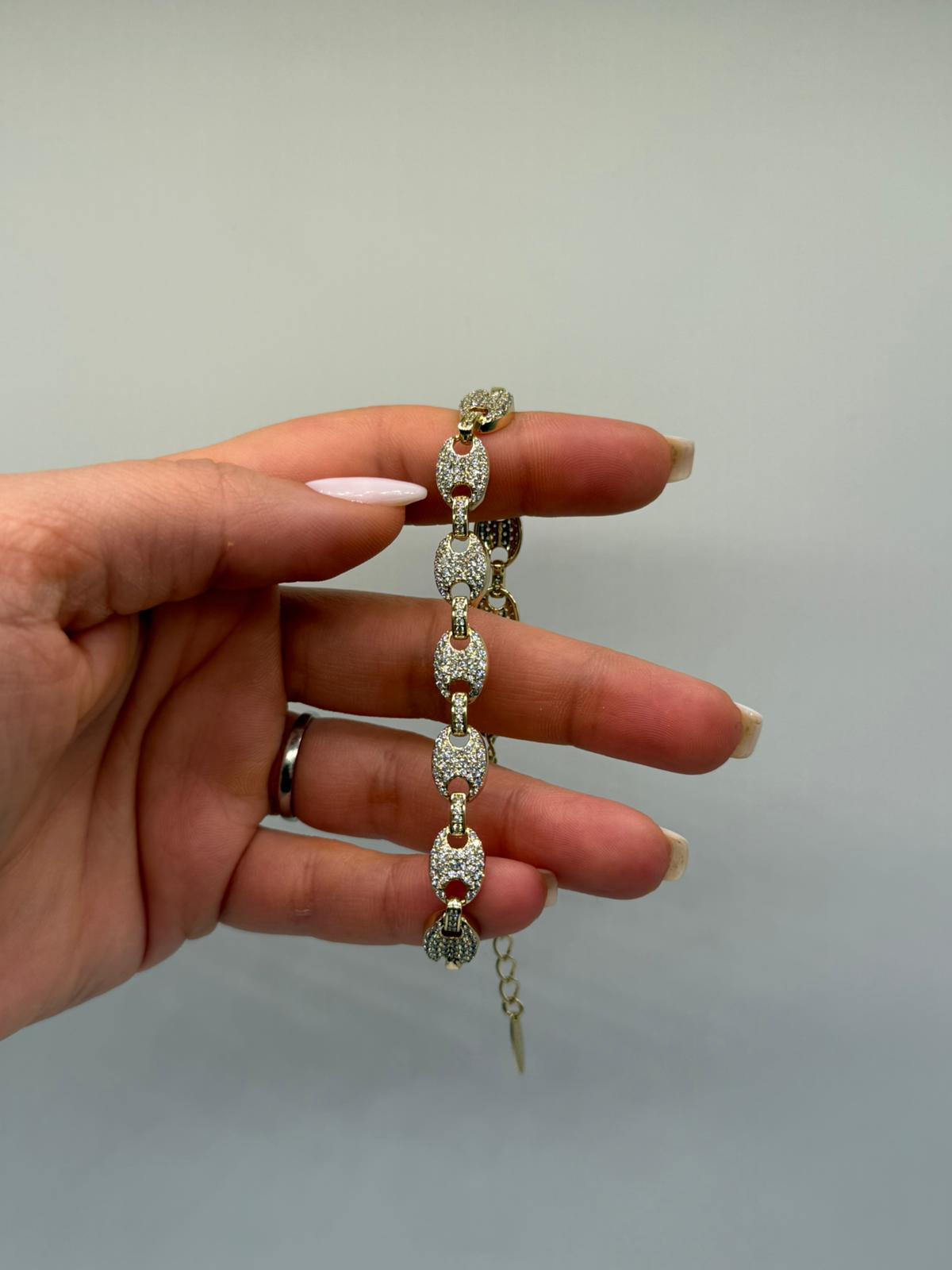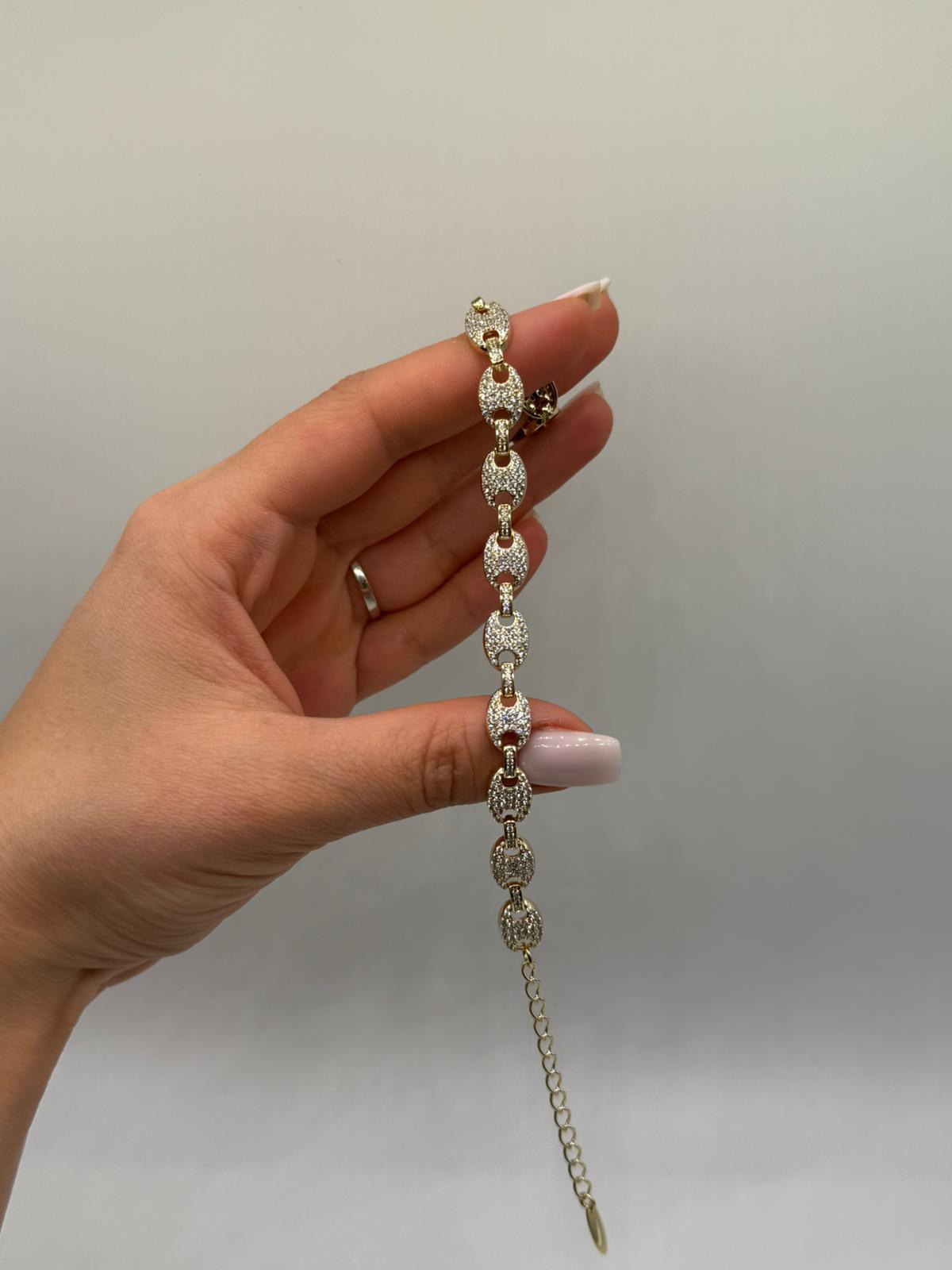 Oval formdaki özel halkaların tamamı parlak zirkon taşlarla kaplanarak tasarlanan bu bileklik, iddialı ve lüks bir duruş sunar. Her bir halka, ışığı güçlü şekilde yansıtarak bilekte dikkat çekici bir ışıltı oluşturur.