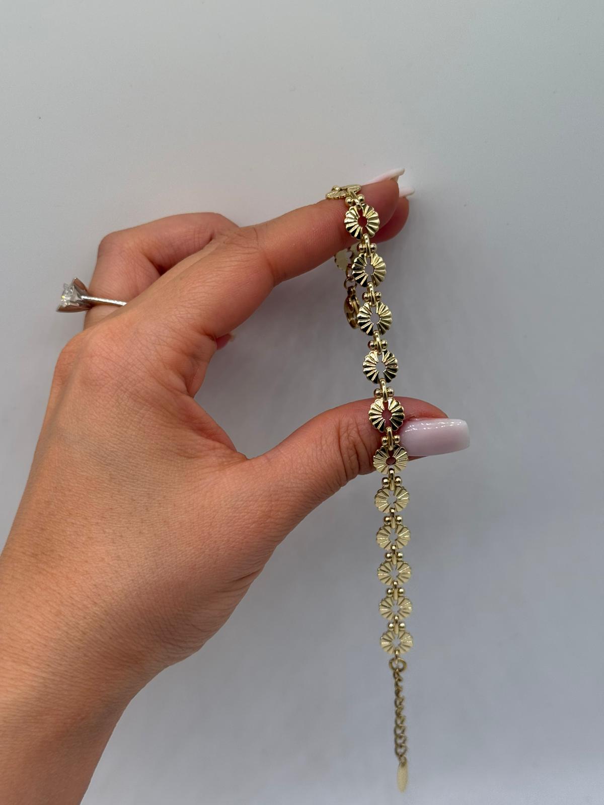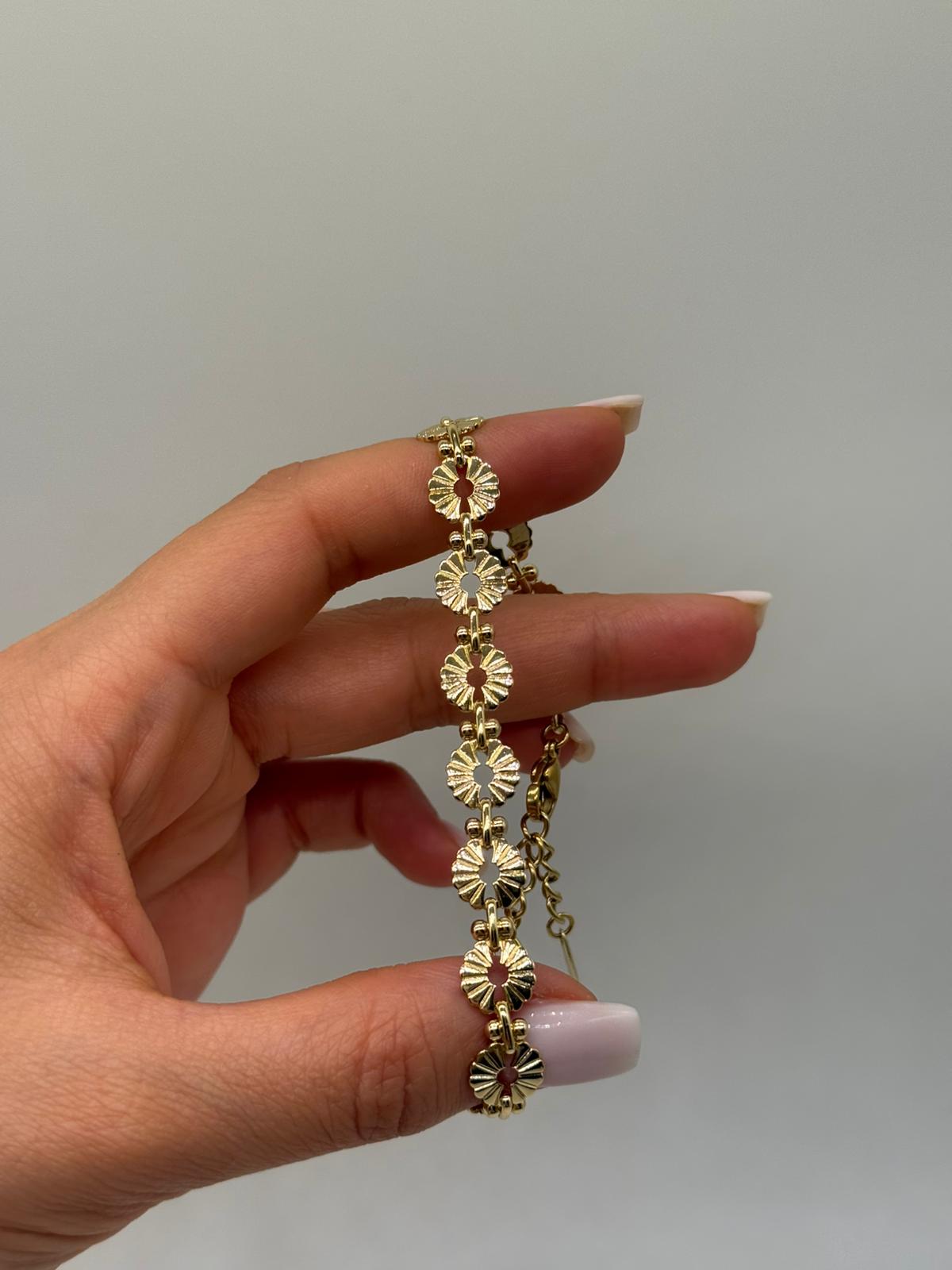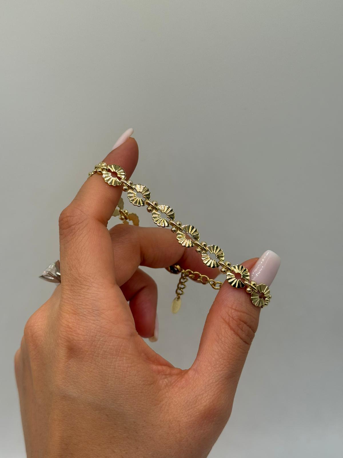 Xuping papatya motifli bileklik, zarif çiçek detayları ve parlak altın renk kaplamasıyla feminen ve romantik bir stil sunar. Art arda dizilmiş papatya formundaki halkalar bileğe hoş bir akış kazandırırken, ayarlanabilir uzatma zinciri sayesinde konforlu kullanım sağlar. Günlük kombinlerden özel davetlere kadar rahatlıkla tercih edilebilir.