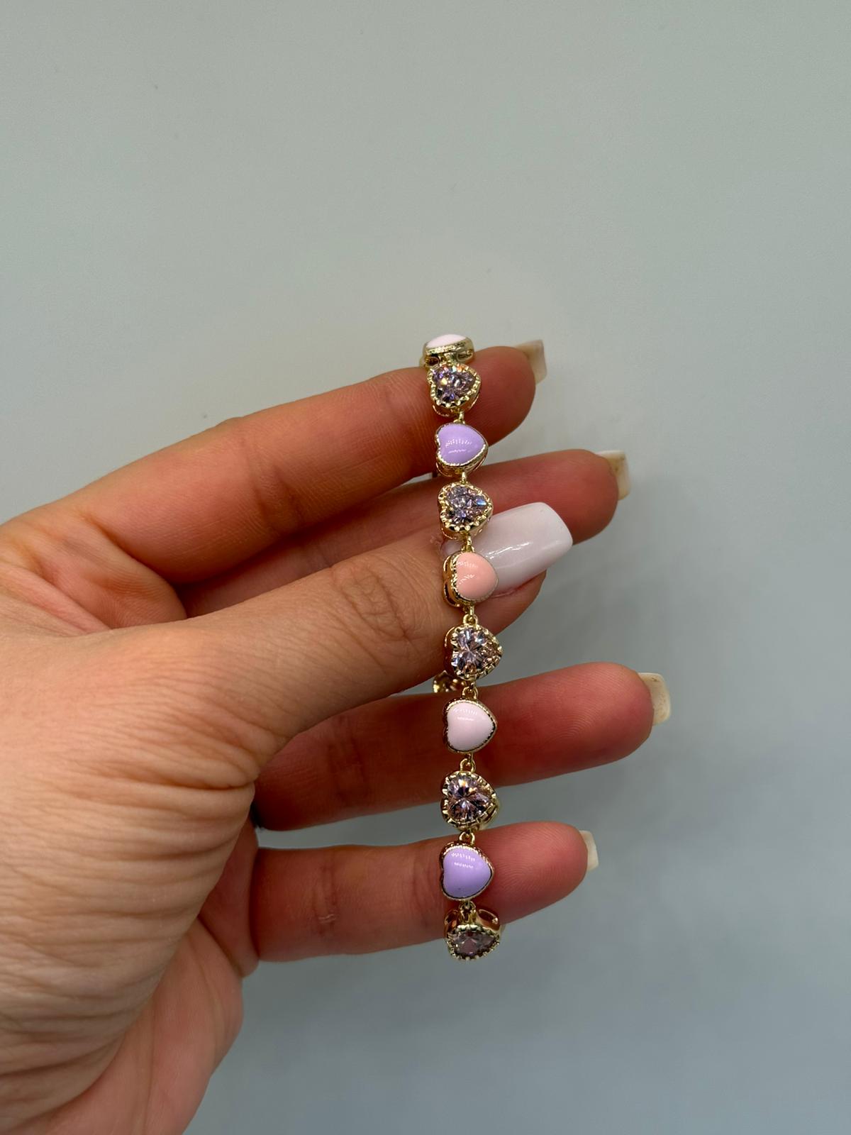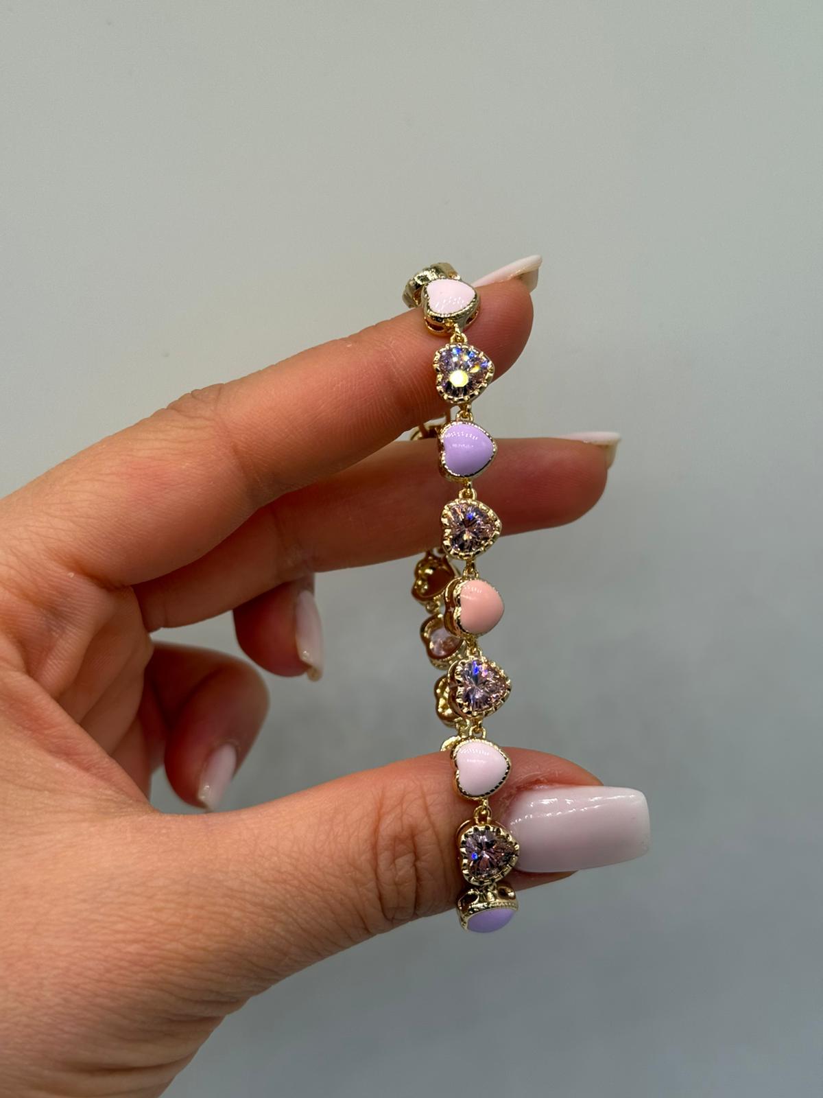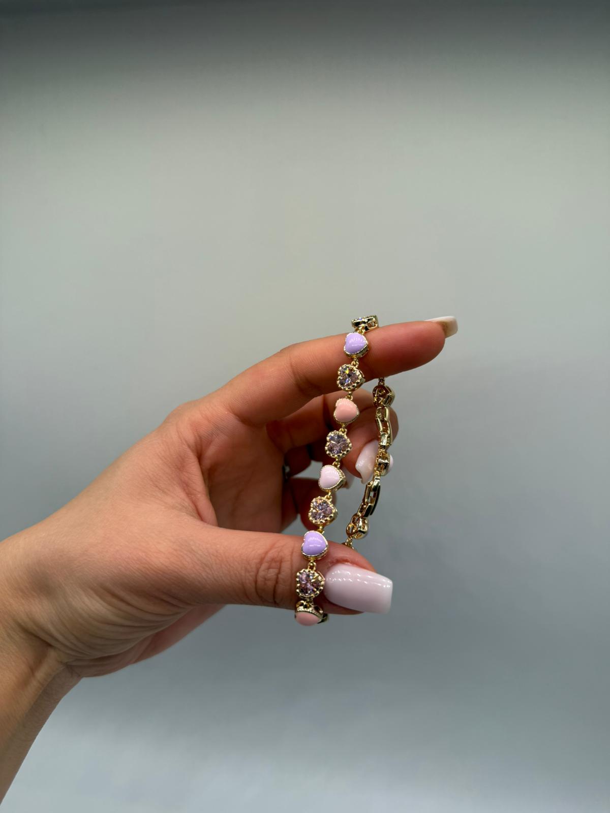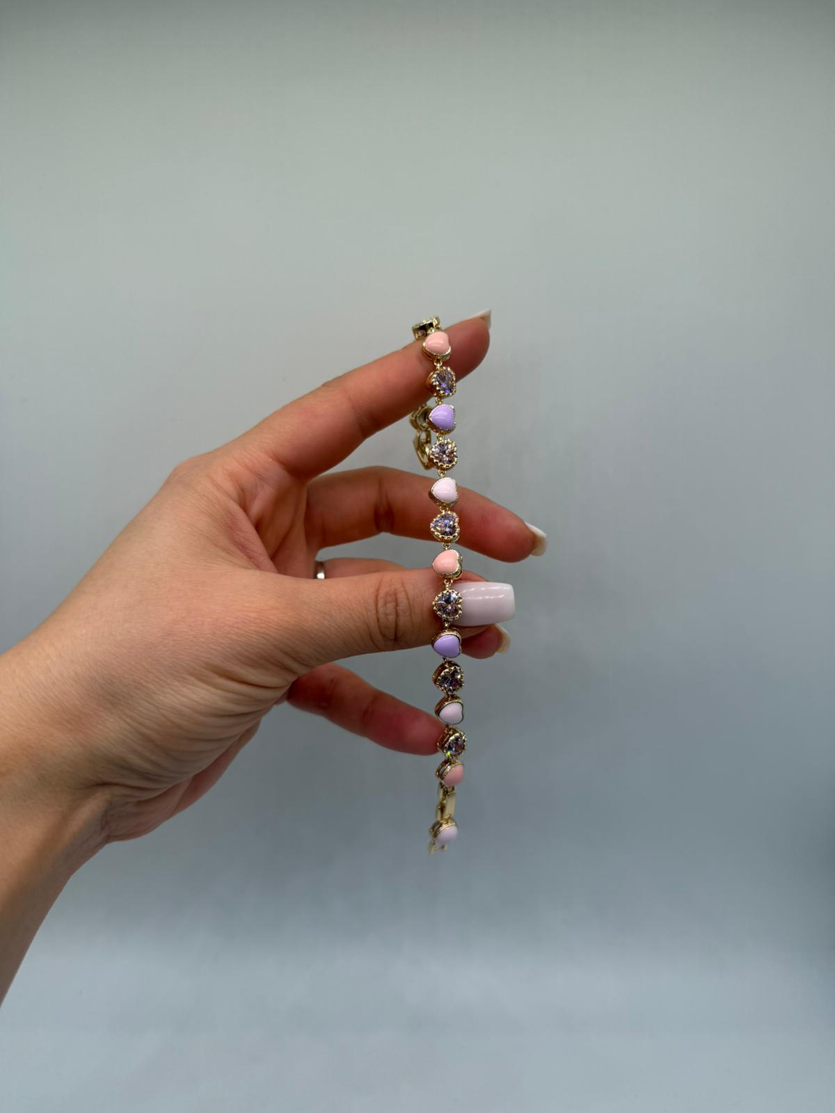 Yumuşak pastel tonların ışıltılı zirkon taşlarla harmanlandığı bu özel tasarım bileklik, zarafeti ve romantik şıklığı bir arada sunar. Pembe ve lila tonlarındaki taş detaylar bileğe hafif ve feminen bir görünüm kazandırırken, aralara yerleştirilen parlak zirkon taşlar tasarıma lüks bir dokunuş ekler.