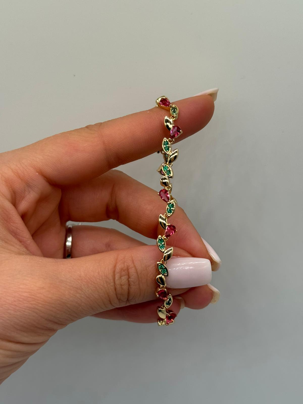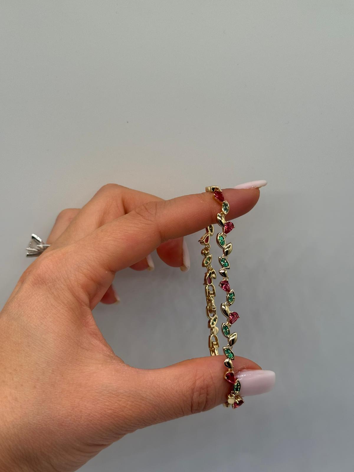Doğadan ve duygulardan ilham alan bu zarif bileklik, kalp ve yaprak formlu renkli taş detaylarıyla feminen ve romantik bir stil sunar. Kırmızı ve yeşil tonların altın renk kaplama ile buluşması, bileklik boyunca canlı ama dengeli bir şıklık oluşturur.