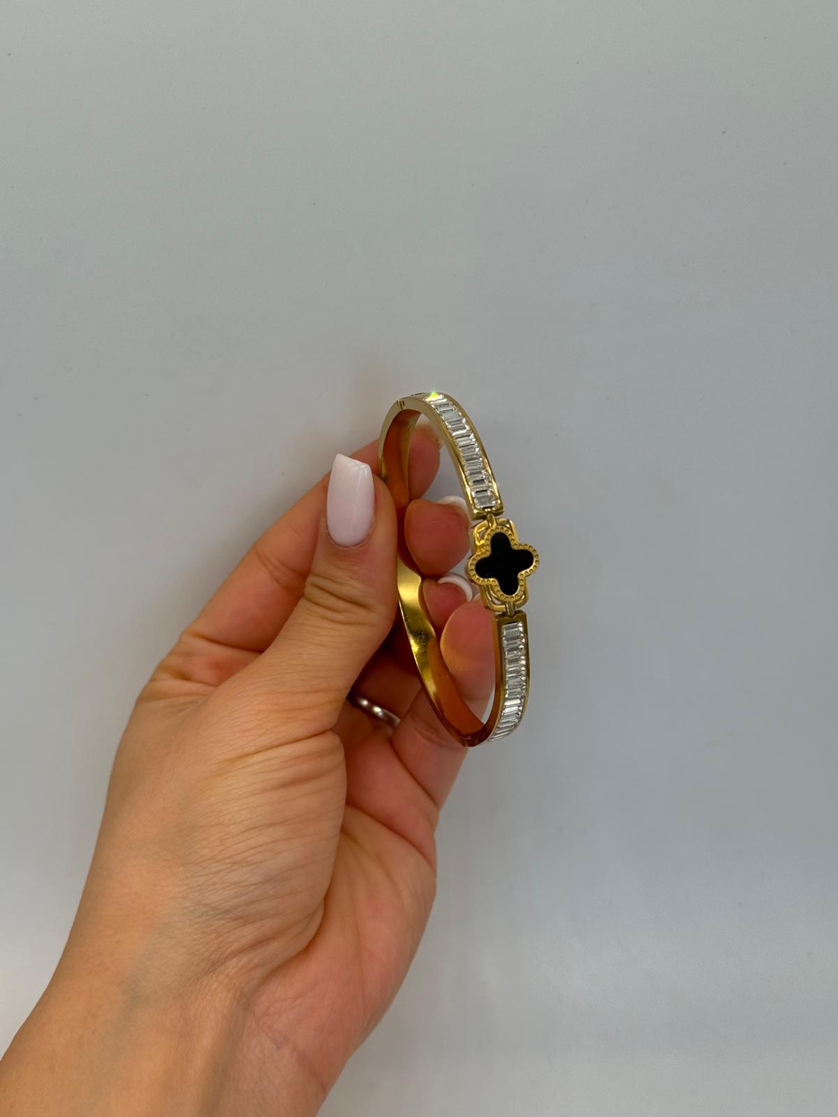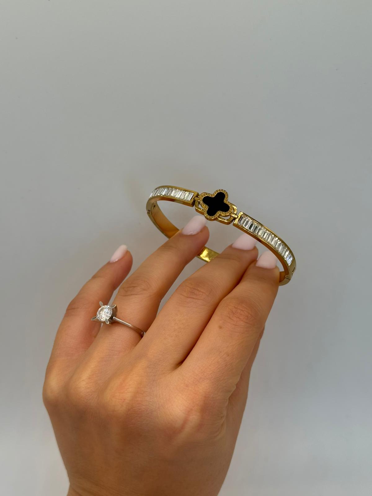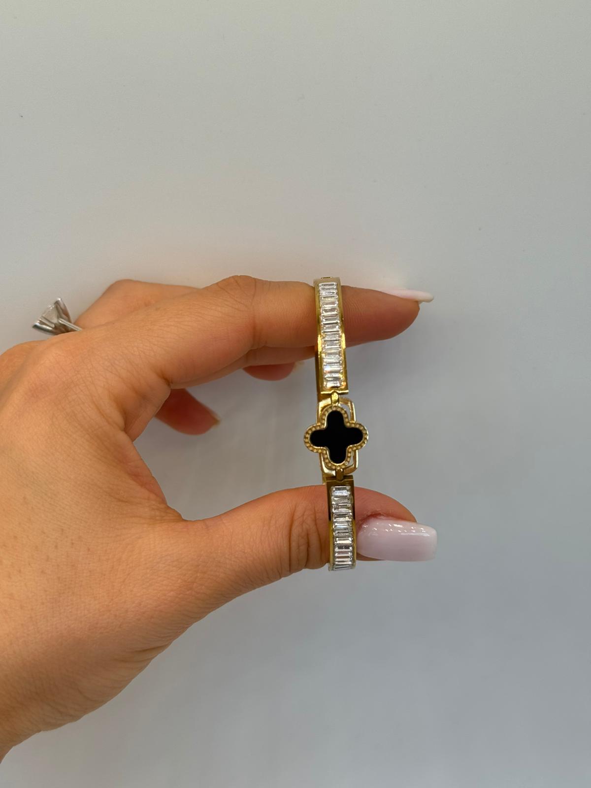 Zarafeti modern detaylarla buluşturan bu kelepçe bileklik, merkezinde yer alan siyah yonca motifiyle güçlü ve sofistike bir duruş sergiler. Bilekliğin yan kısımlarında kullanılan baget kesim taşlar, tasarıma net bir ışıltı ve lüks bir görünüm kazandırır. Altın renk kaplama yüzeyiyle dikkat çeken bu model, hem günlük kullanımda hem de özel davetlerde stilinizi tamamlayacak şık bir aksesuardır. Tek başına kullanıldığında sade ve etkileyici, farklı bilekliklerle kombinlendiğinde ise iddialı bir görünüm sunar.
