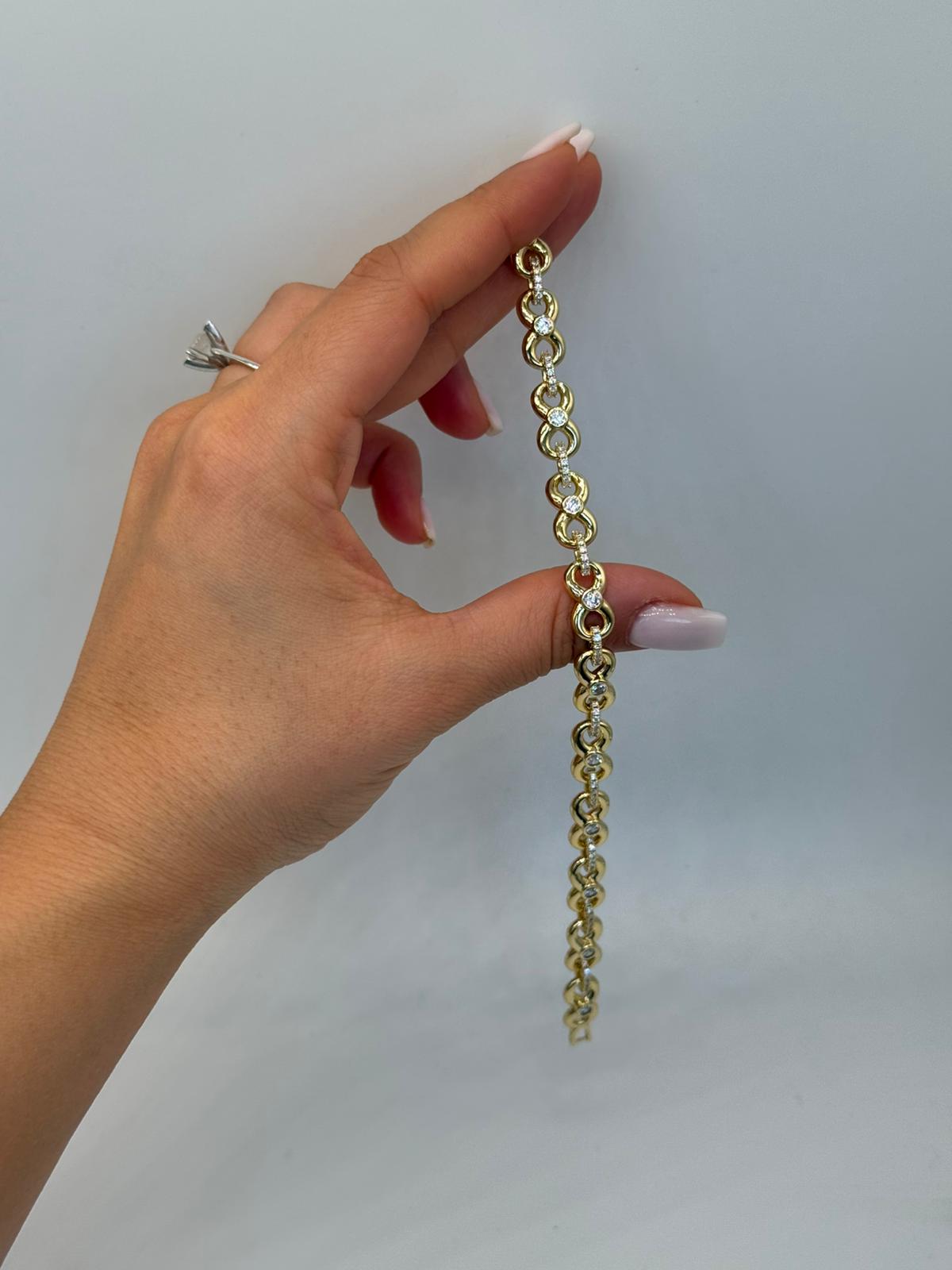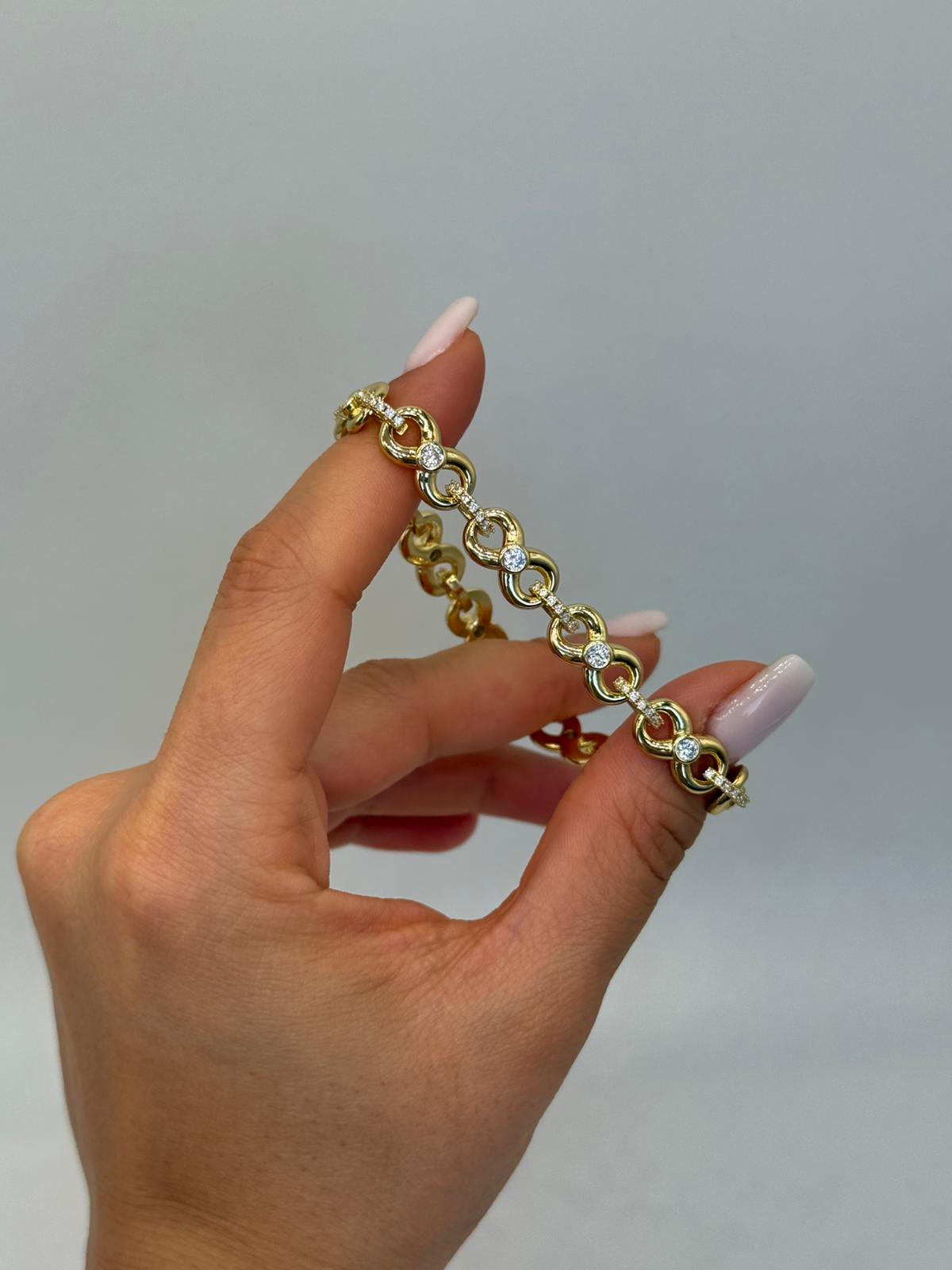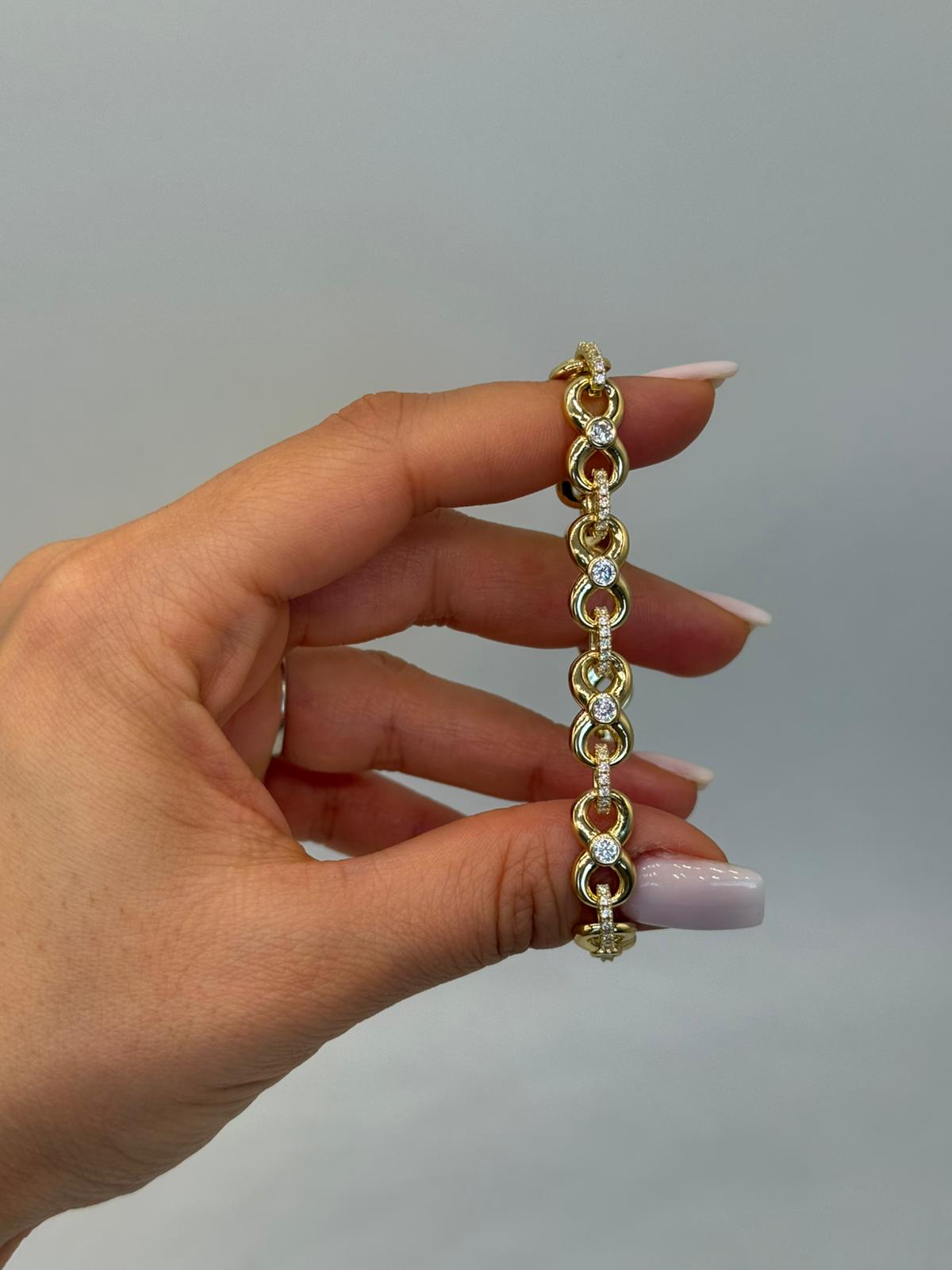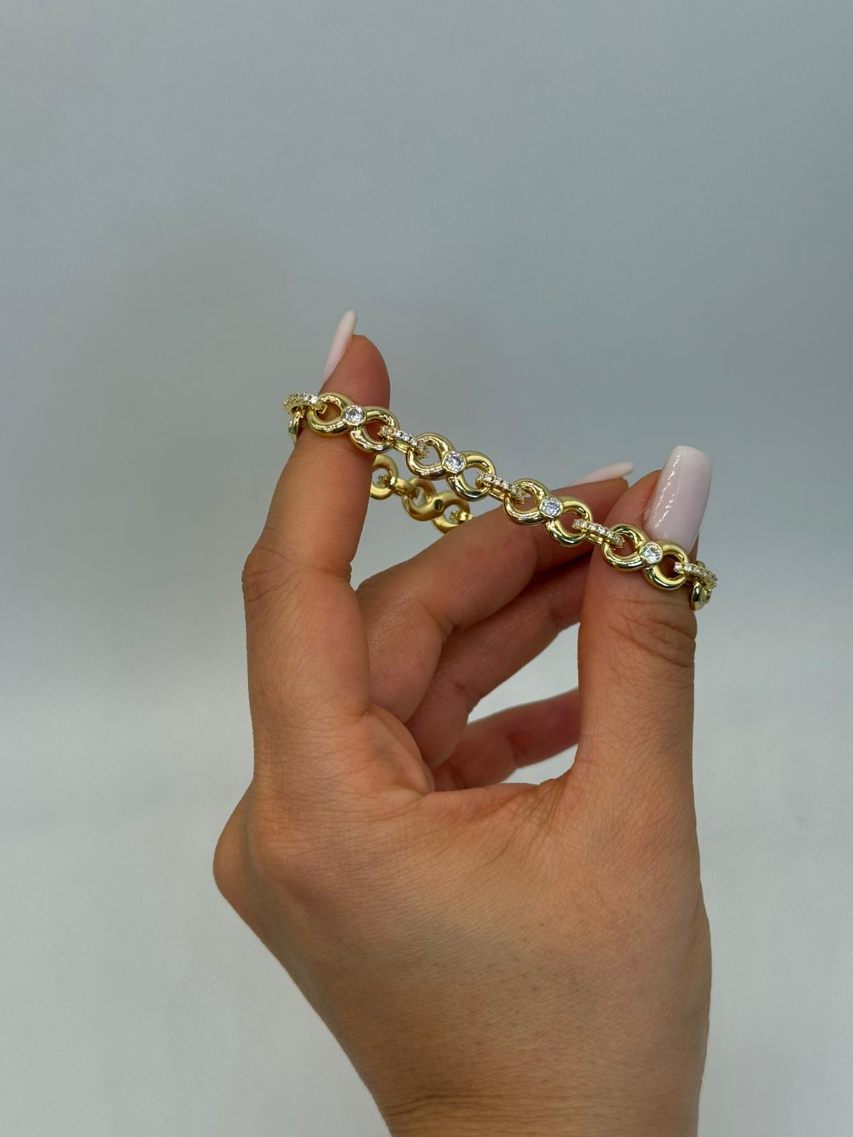 Zamansız zincir formu ile zarif taş detaylarını bir araya getiren bu bileklik, şıklığı günlük kullanıma uyarlayan özel bir tasarımdır. Birbirine geçmeli halka formu, her halkada yer alan parlak taşlarla hareket kazanırken bilekte dengeli ve estetik bir duruş sunar. Altın renk kaplama yapısı sayesinde kombinlere sıcak bir ışıltı katar. Tek başına kullanıldığında sade bir şıklık, diğer bilekliklerle birlikte kullanıldığında ise modern ve güçlü bir stil yaratır. Günlük kombinlerden özel davetlere kadar her ortamda rahatlıkla tercih edilebilir.