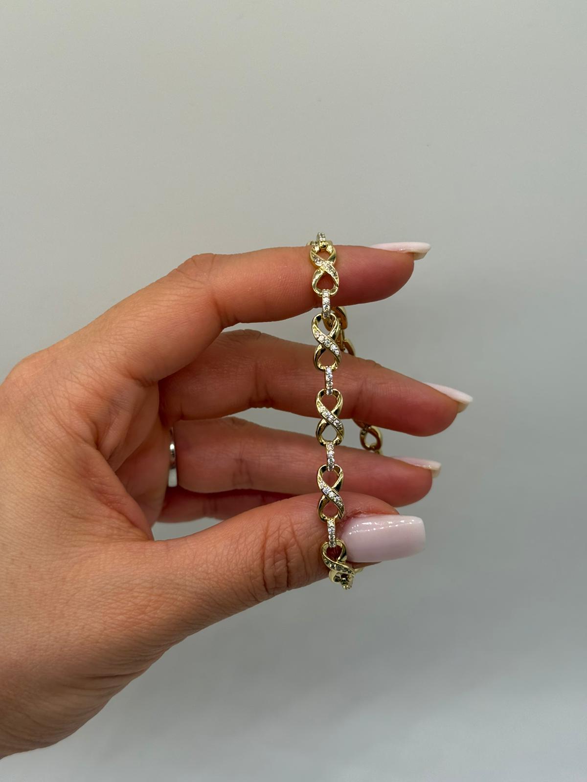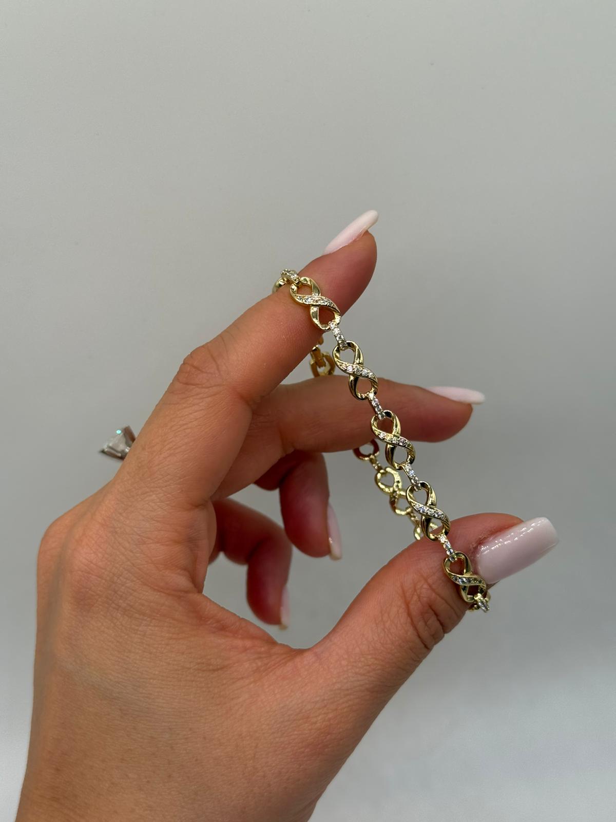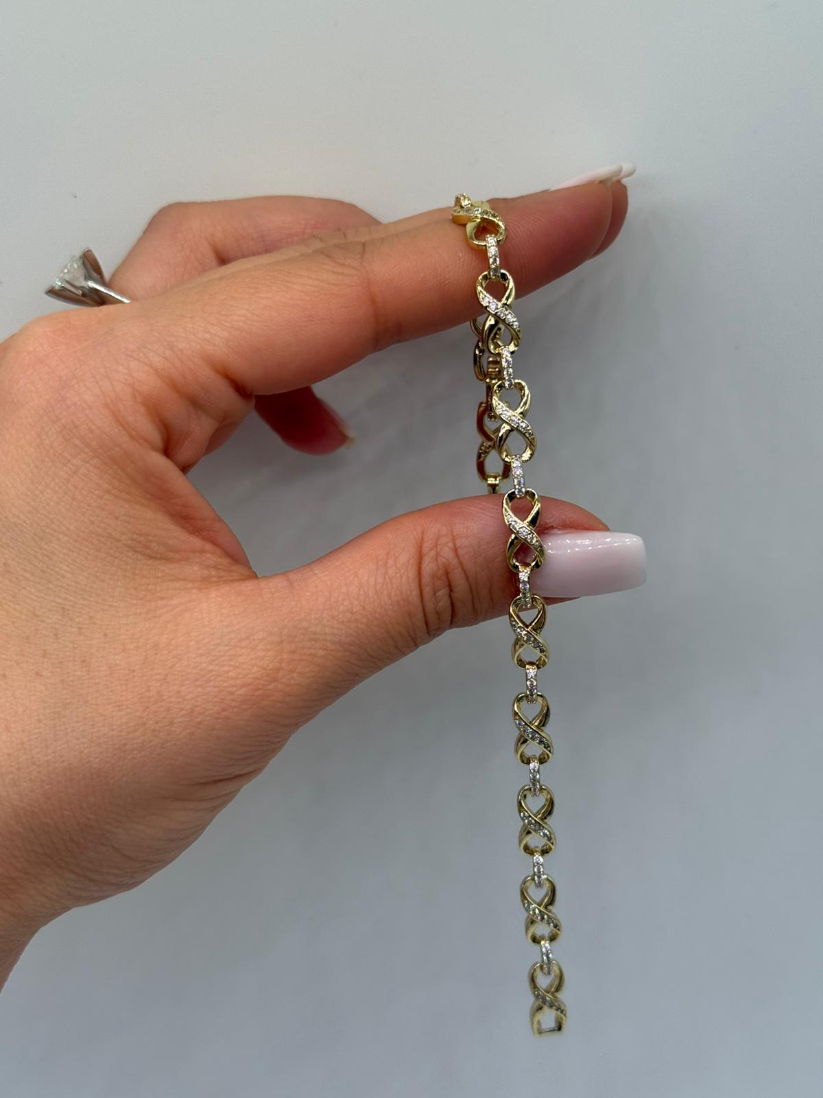 Xuping sonsuzluk figürlü bileklik, kalp formuyla birleşen zarif tasarımıyla romantik ve anlamlı bir stil sunar. Taşlı sonsuzluk motifleri, bilek boyunca dengeli bir şekilde sıralanarak şık bir bütünlük oluşturur. Altın renk kaplaması sayesinde feminen ve göz alıcı bir duruş sağlar. Günlük kullanımdan özel anlara kadar her kombine uyum sağlar.