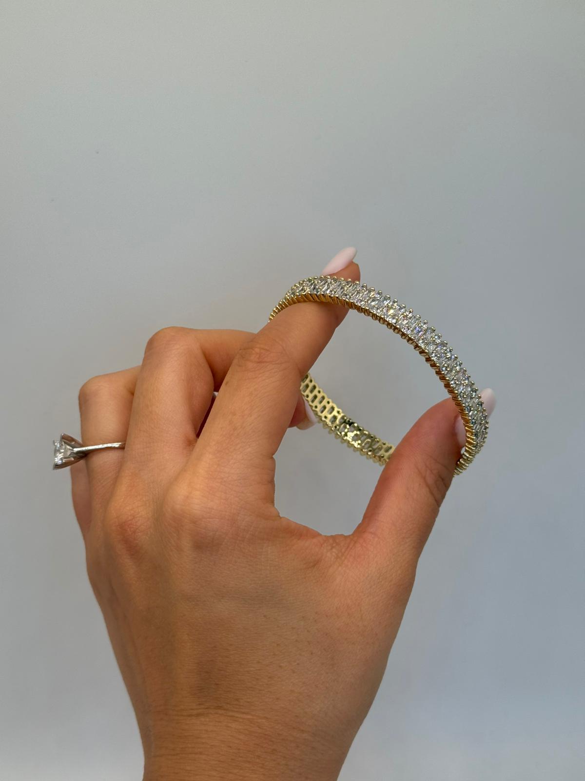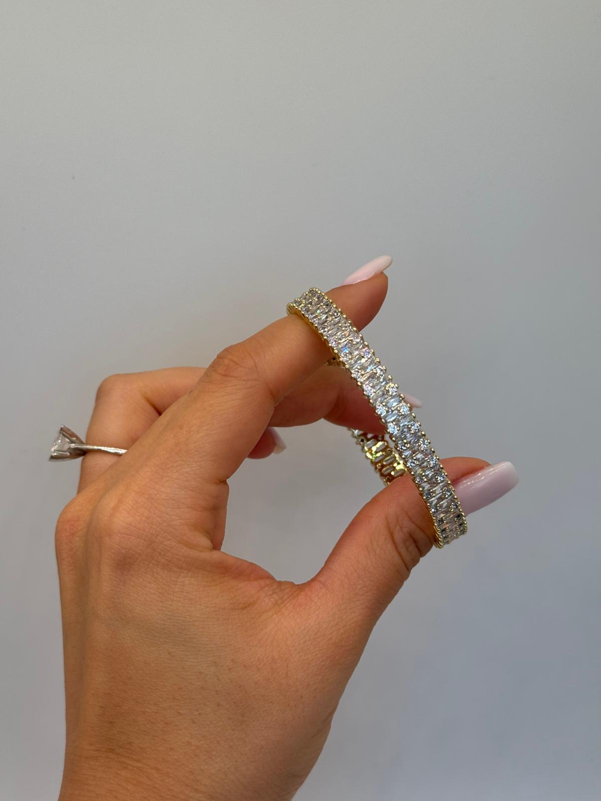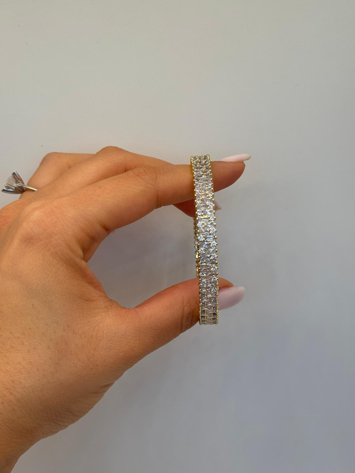 Işıltılı taşlarla baştan sona süslenen bu zarif bileklik, klasik şıklığı modern bir dokunuşla buluşturur. İnce işçiliği ve parlak taş dizilimi sayesinde bilekte son derece göz alıcı durur. Hem günlük kombinlerde hem de özel davetlerde tek başına kullanıldığında dahi şıklığı tamamlayan güçlü bir aksesuardır.
