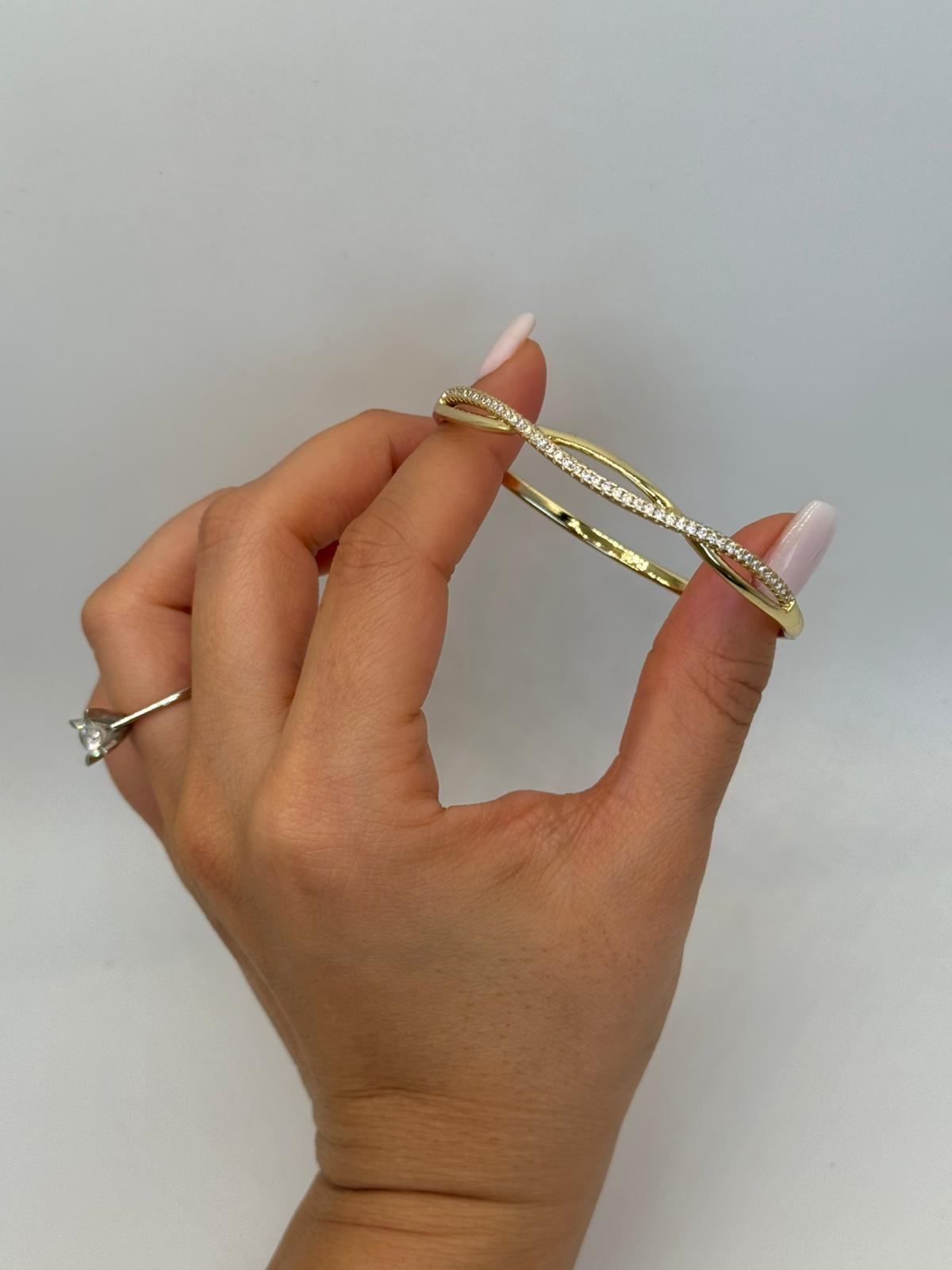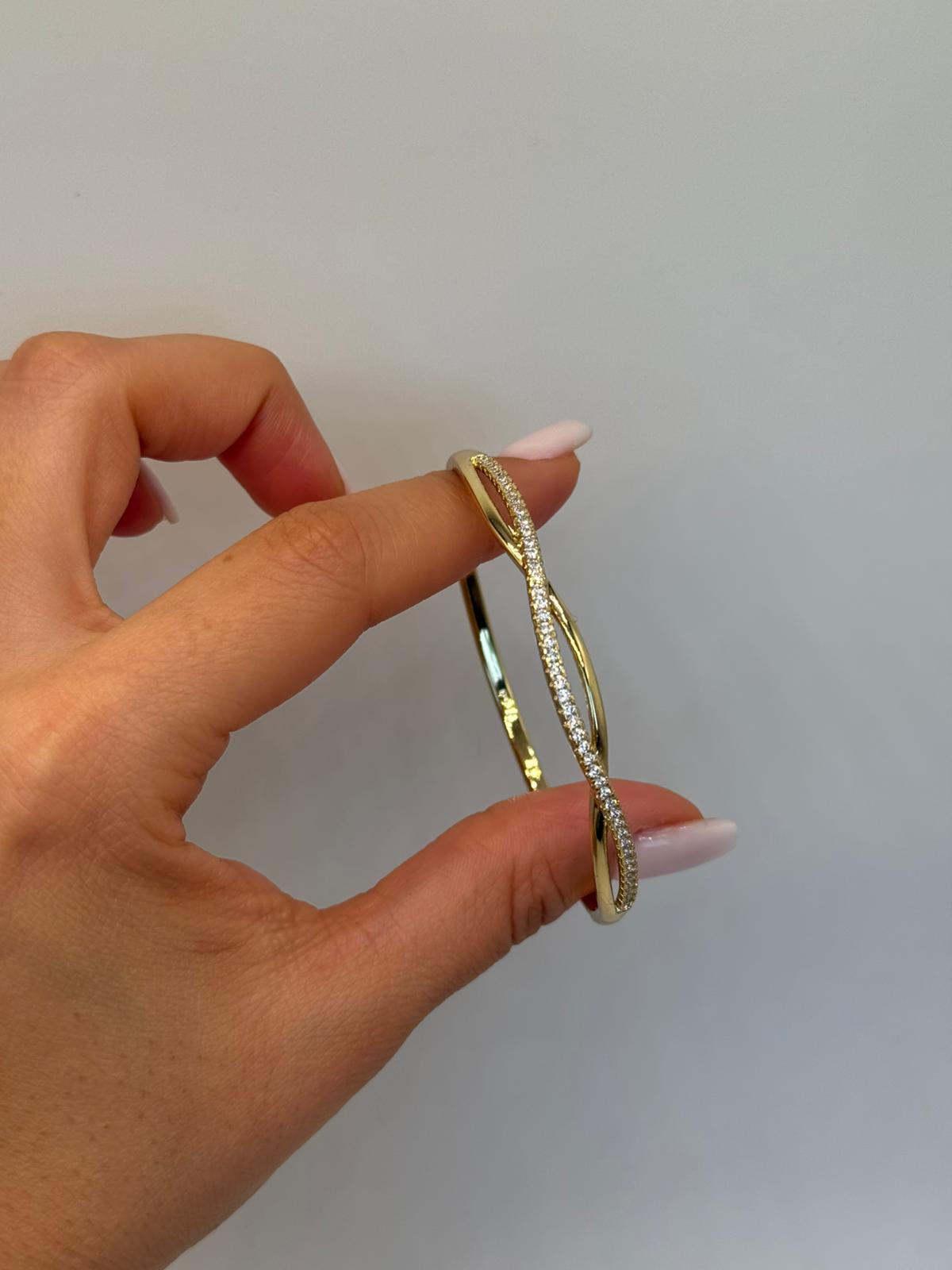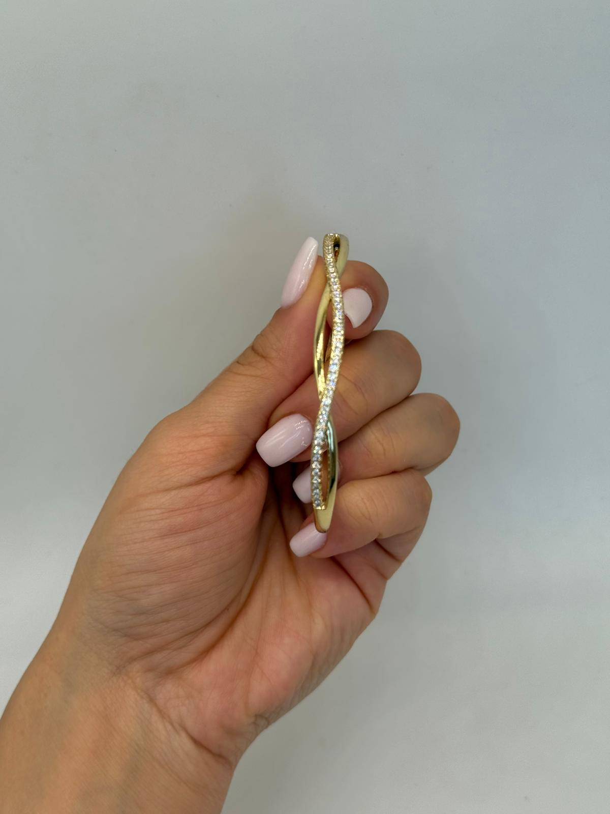 Akıcı dalga formu ve zarif taş dizilimiyle öne çıkan bu kelepçe bileklik, minimal şıklığı modern bir tasarımla buluşturur. Altın renk kaplaması bileğe sıcak ve parlak bir görünüm kazandırırken, taşlı orta hat tasarıma ışıltılı bir denge katar. İnce yapısı sayesinde bilekte hafif durur, tek başına kullanıldığında zarif, diğer bilekliklerle kombinlendiğinde ise iddialı bir stil sunar. Günlük kullanıma ve özel anlara uyum sağlayan zamansız bir parçadır.