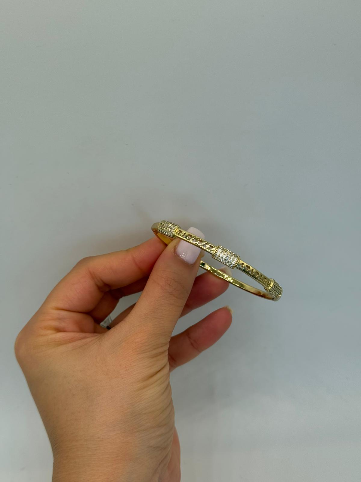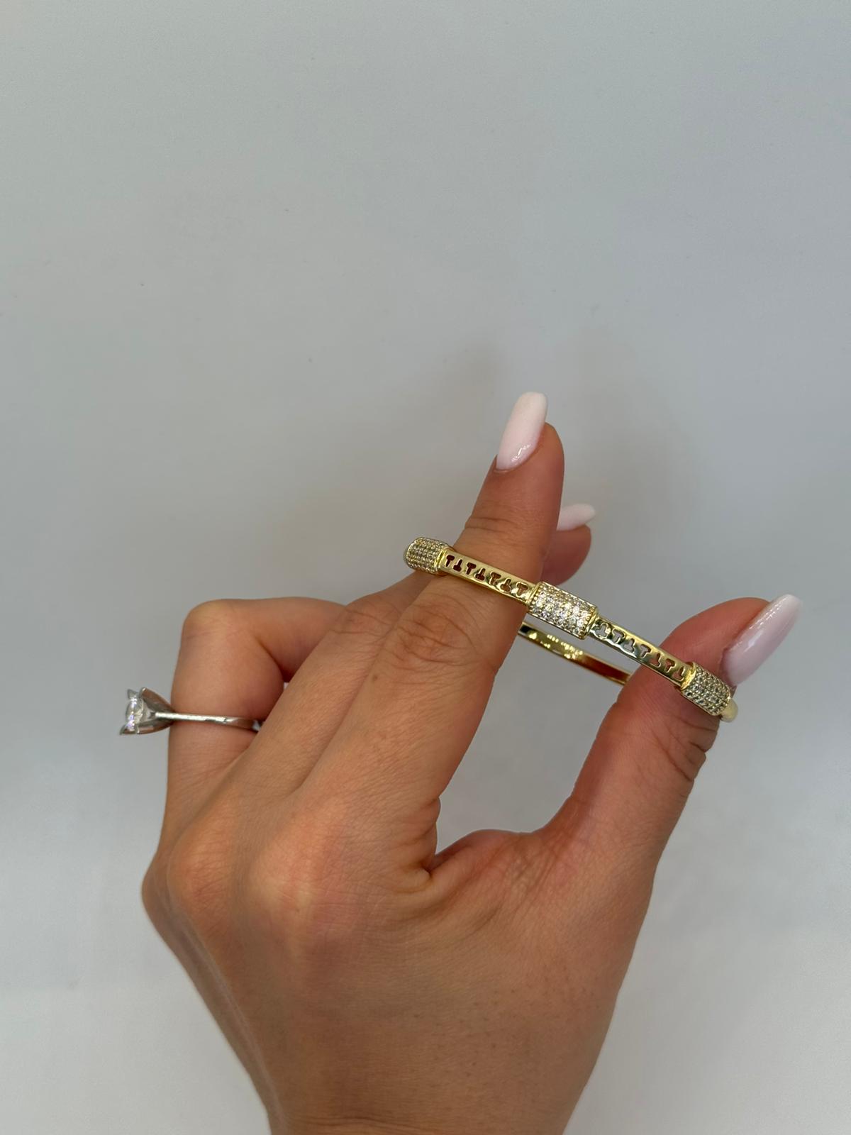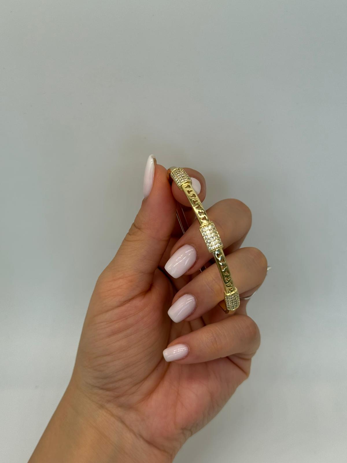 Zincir formundan ilham alan tasarımıyla modern ve güçlü bir stil sunan bu kelepçe bileklik, altın renk kaplama yüzeyiyle göz alıcı bir şıklık kazandırır. Orta bölümde yer alan taşlı detaylar tasarıma zarif bir ışıltı eklerken, minimal ama dikkat çekici formu sayesinde bilekte dengeli ve şık bir duruş sağlar. Günlük kombinlerden özel davetlere kadar geniş kullanım alanına sahip olan bu model, tek başına kullanıldığında sade bir şıklık, farklı bilekliklerle kombinlendiğinde ise iddialı bir görünüm sunar.