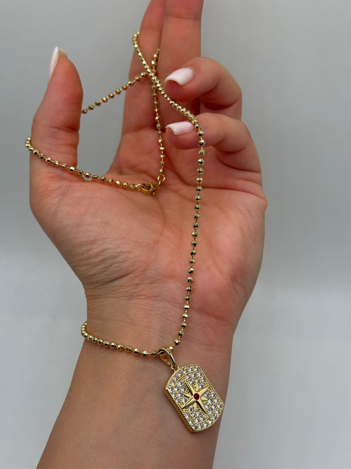 Xuping kalitesiyle üretilen bu taşlı dog tag kolye, güçlü ve dikkat çekici tasarımıyla öne çıkar. Gold renk boncuk zincir üzerine yerleştirilen dikdörtgen plaka, zirkon taşlarla kaplanmış olup merkezinde kırmızı taş detaylı yıldız motifi bulunur. Işıltılı yüzeyi sayesinde tek başına bile güçlü bir stil oluşturur. Hem günlük kombinlerde hem de özel günlerde rahatlıkla kullanılabilir. 60 cm uzunluk