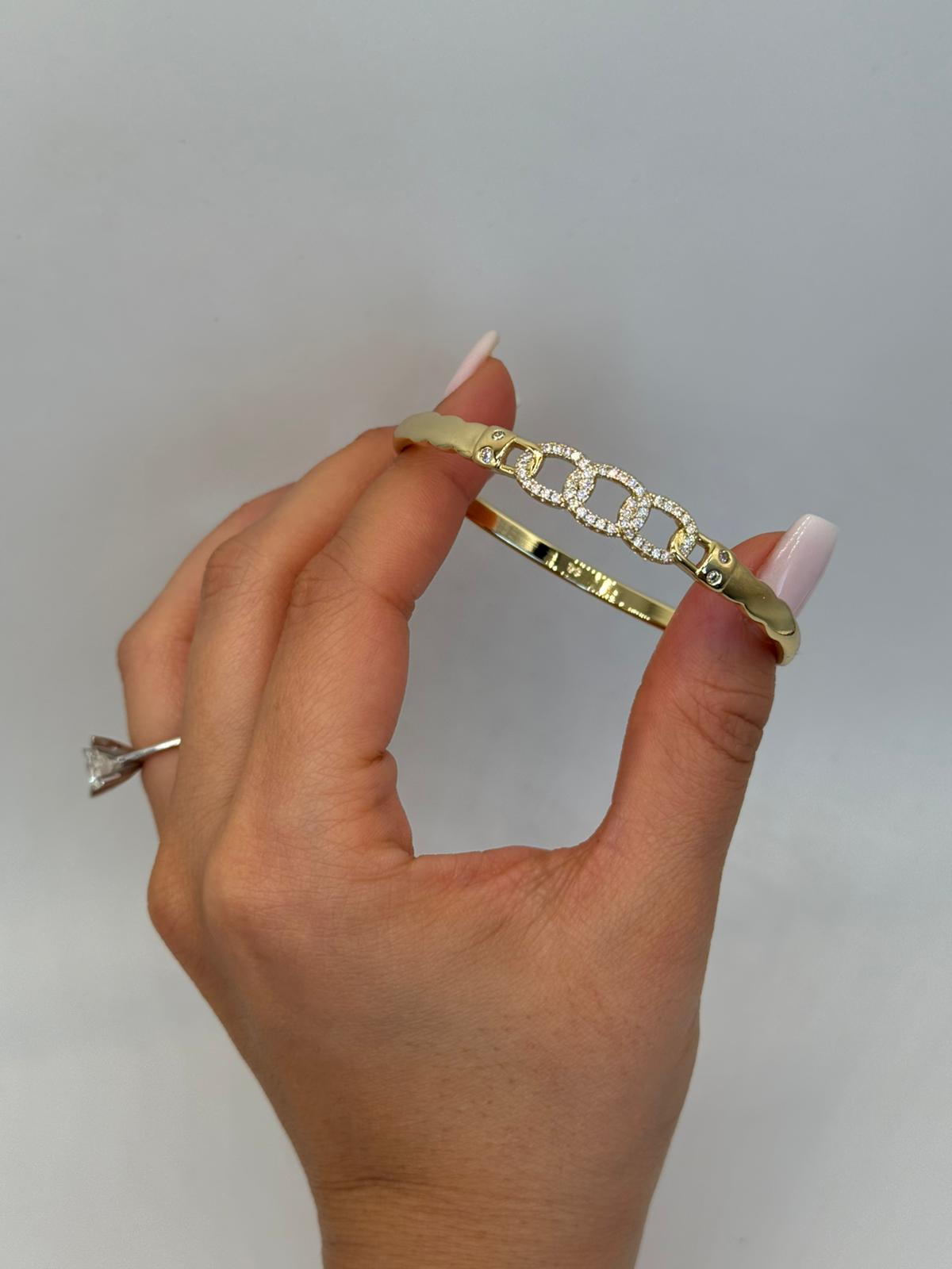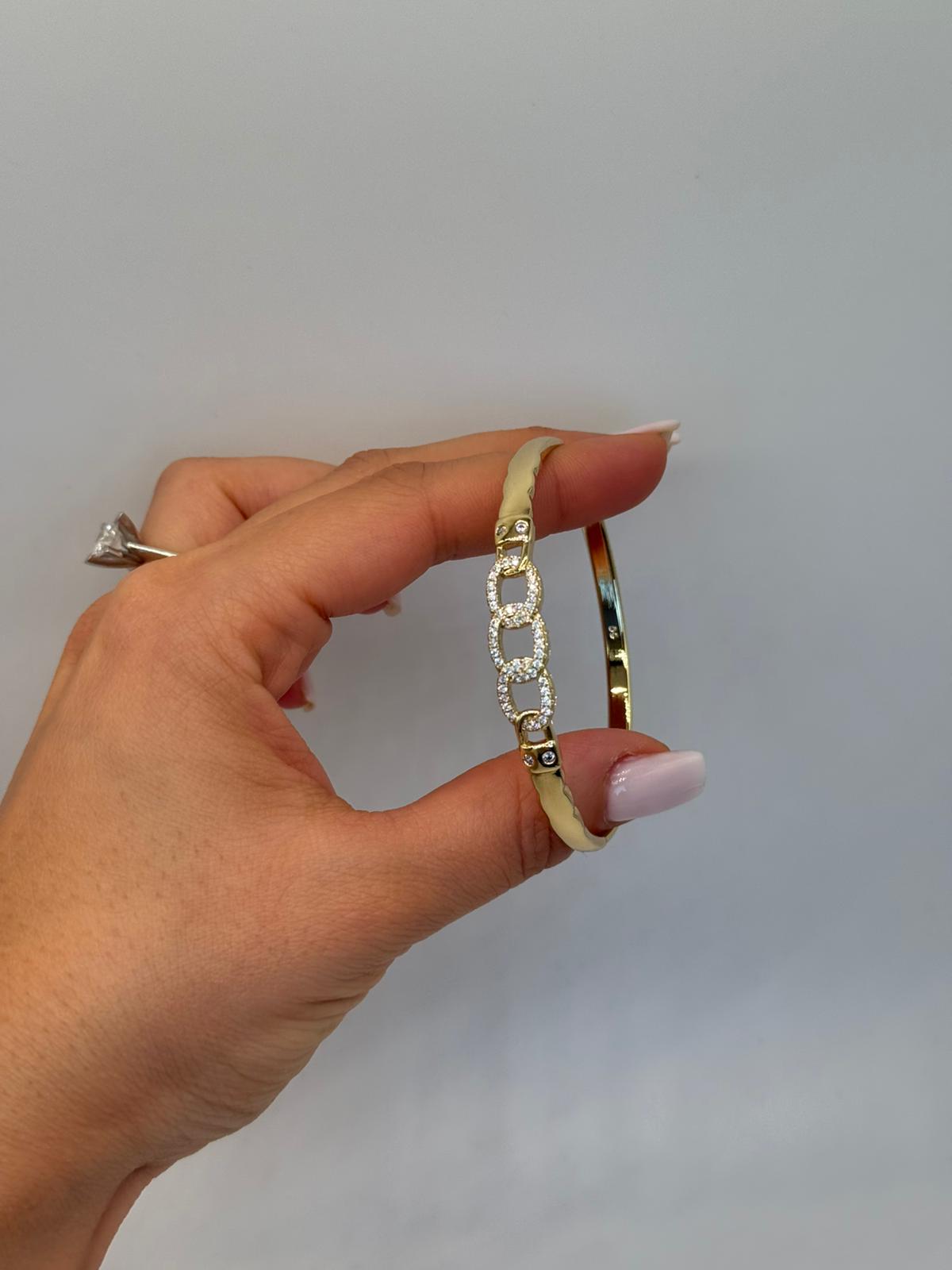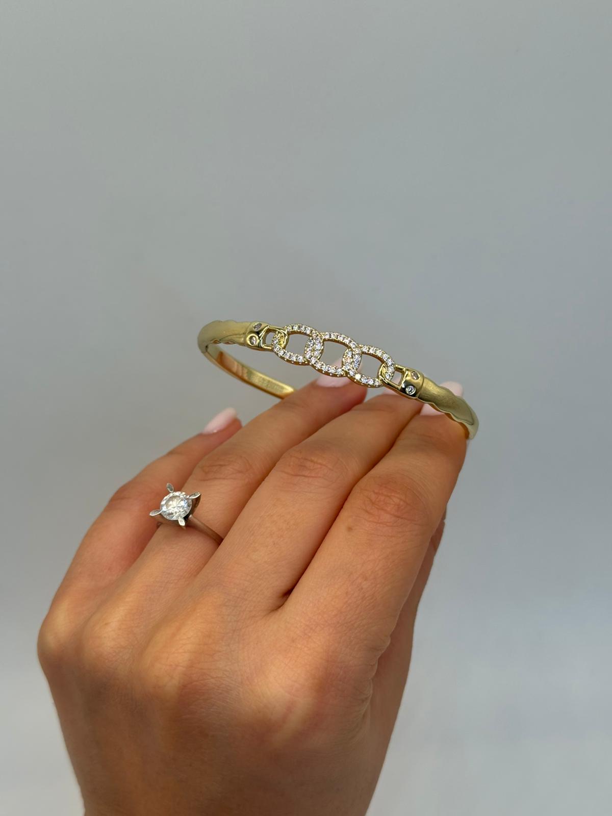 Zarif zincir formu ve ışıltılı taş detaylarıyla tasarlanan bu kelepçe bileklik, modern ve şık bir görünüm sunar. Altın renk kaplaması sayesinde bilekte güçlü bir duruş sergilerken, orta bölümdeki taşlı zincir detayı tasarıma sofistike bir dokunuş katar. Kilitli kelepçe yapısı ile kolay takılıp çıkarılır ve güvenli kullanım sağlar. Günlük kombinlerden özel davetlere kadar her stile uyum sağlayan, zamansız bir aksesuardır.