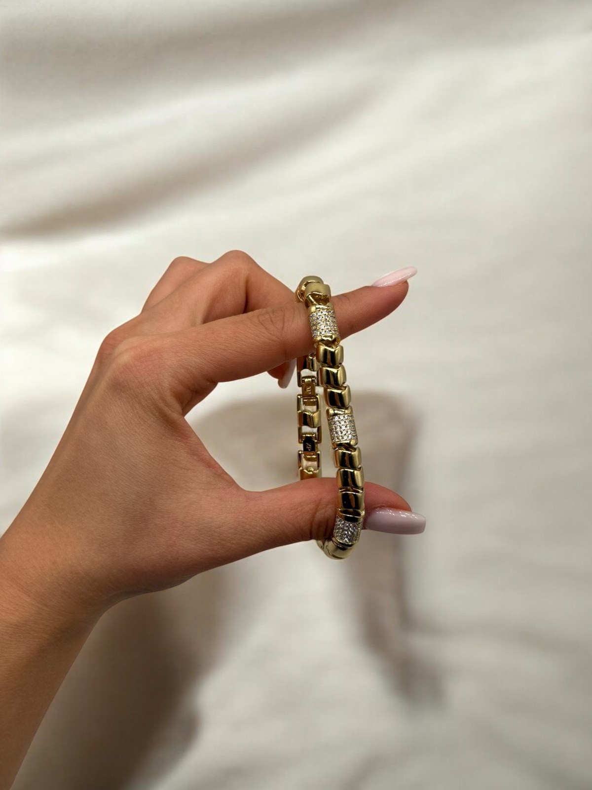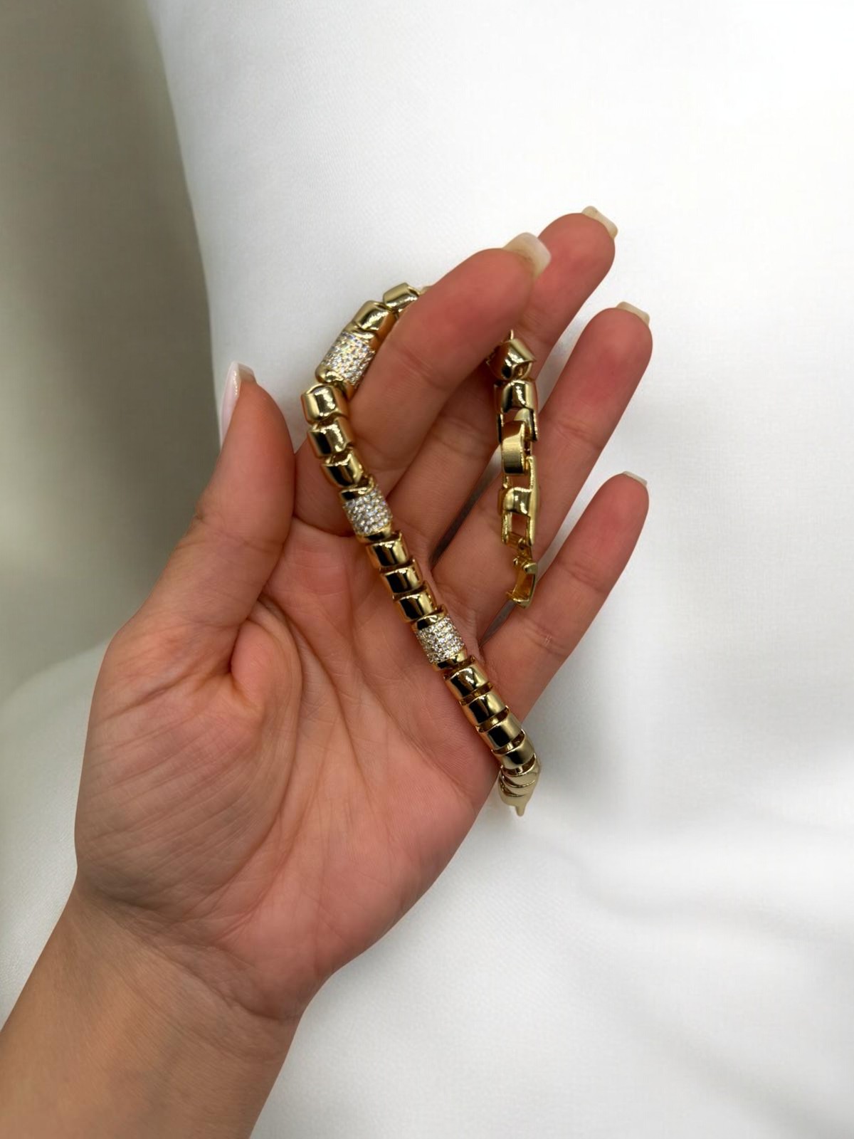 Zincir boyunca dengeli şekilde yerleştirilen zirkon taşlı geçişler, bilek hareketiyle birlikte ışığı zarifçe yansıtır.