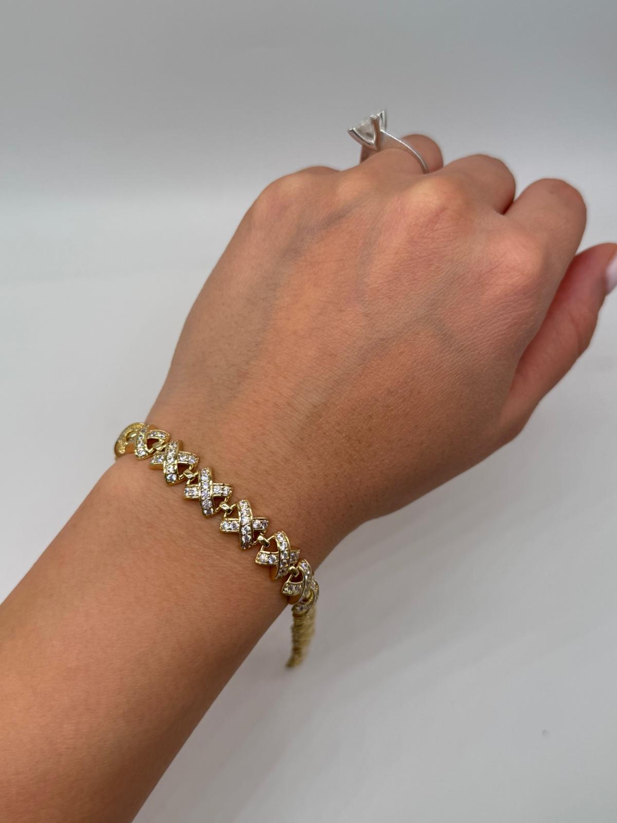 Şık çapraz (X) motifleriyle tasarlanan Xuping zirkon taşlı bileklik, her bir motife işlenmiş parlak zirkon taşları sayesinde bilekte güçlü ve modern bir ışıltı sunar.