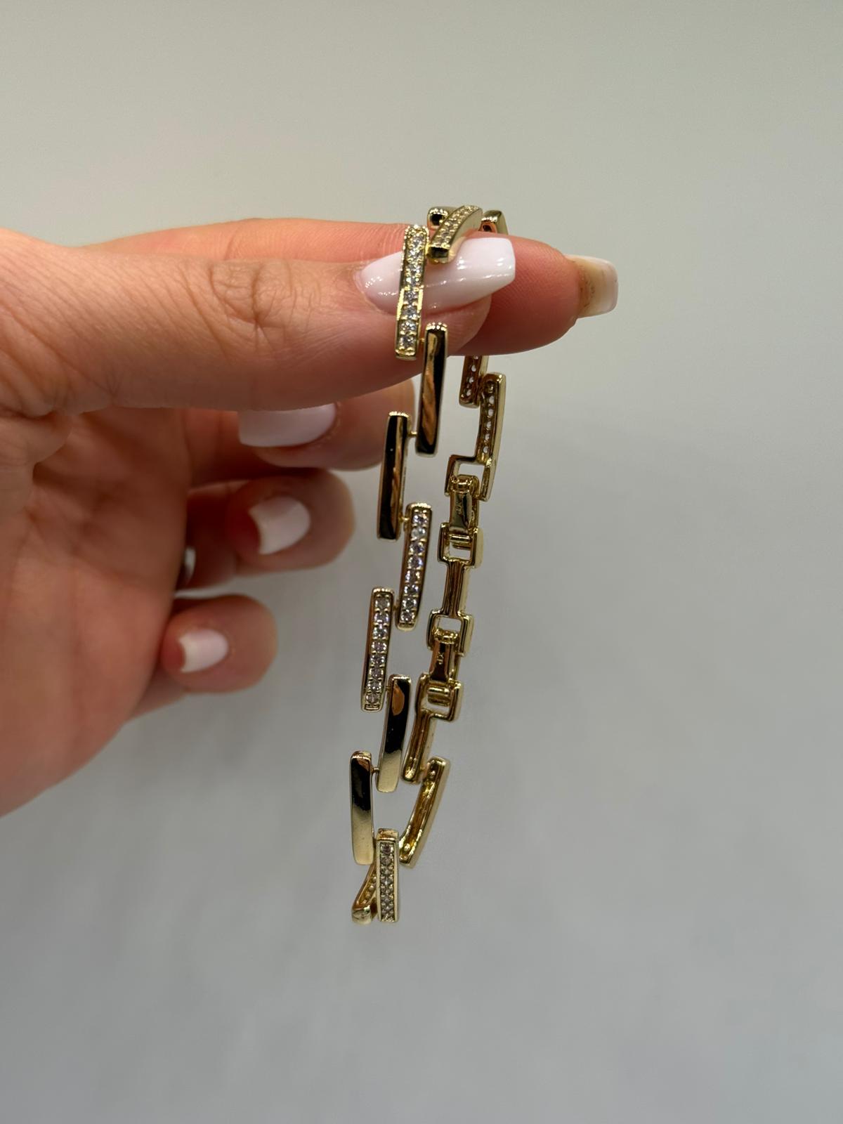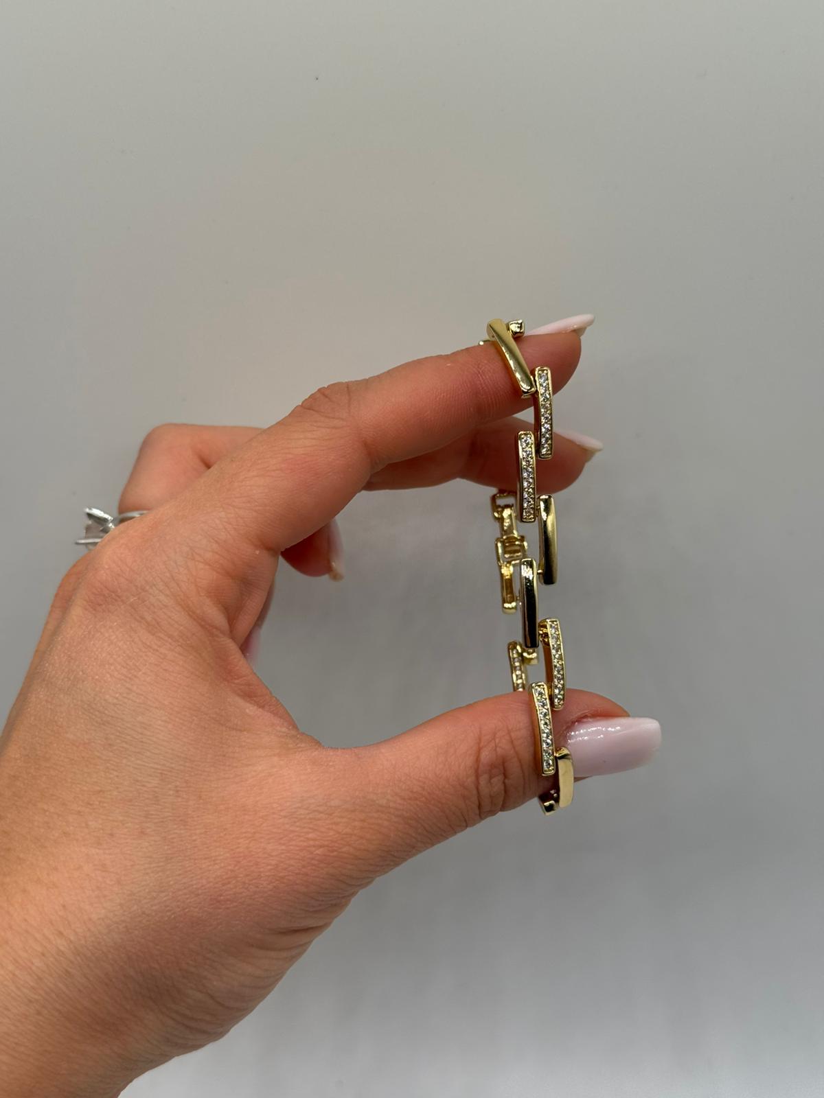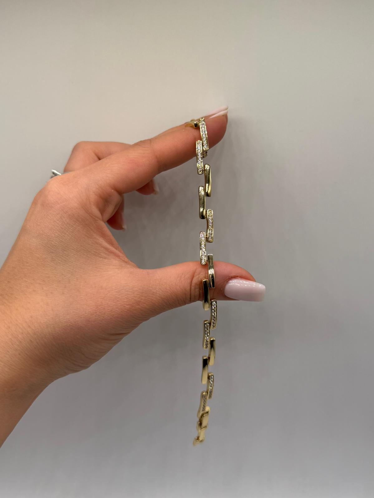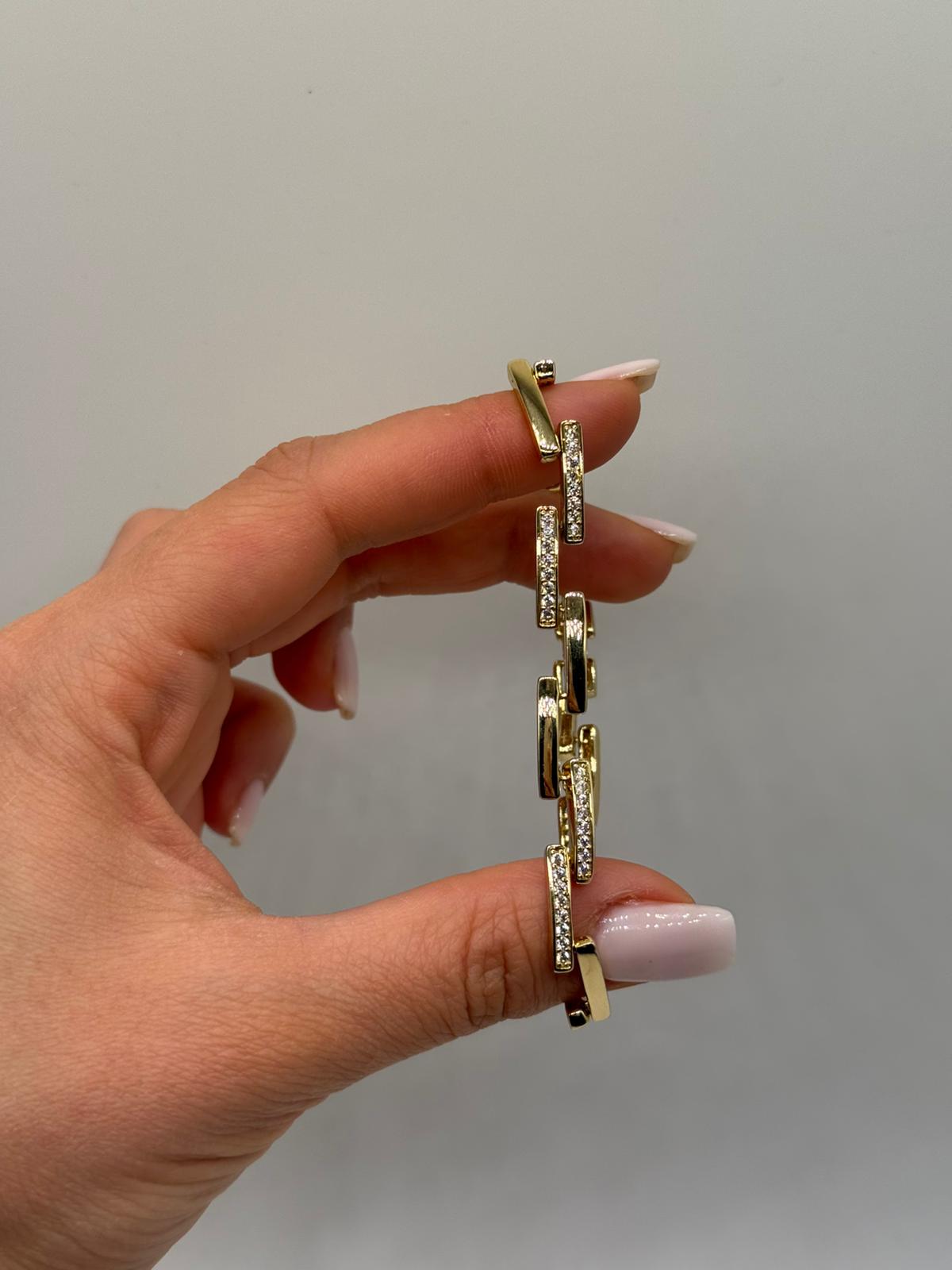 Modern çizgilerden ilham alan bu bileklik, zirkon taşlarla süslenmiş geometrik çubuk formu sayesinde güçlü ve sofistike bir görünüm sunar. Düz ve taşlı yüzeylerin dengeli geçişi, bileklik boyunca sade ama dikkat çekici bir şıklık yaratır.