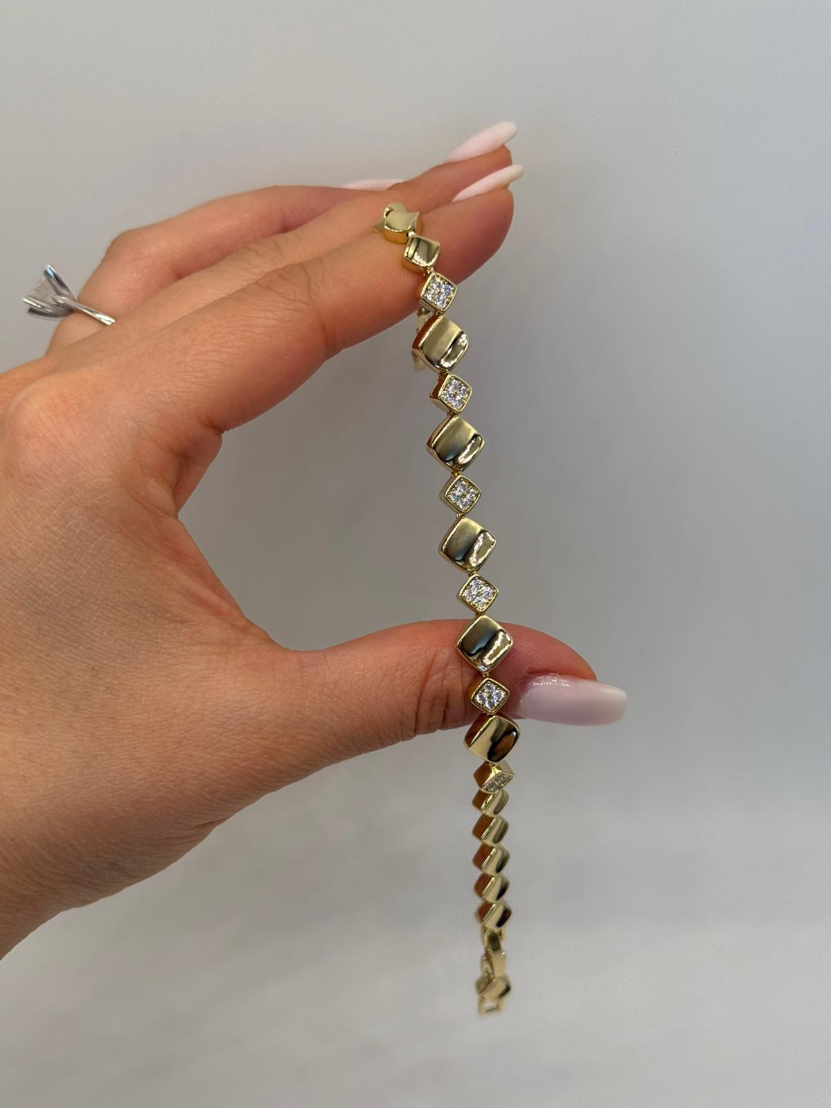 Modern ve şık tasarımıyla öne çıkan Xuping zirkon taşlı bileklik, geometrik formdaki parlak yüzeyler ve ışıltılı zirkon taş detaylarıyla zarif bir görünüm sunar.