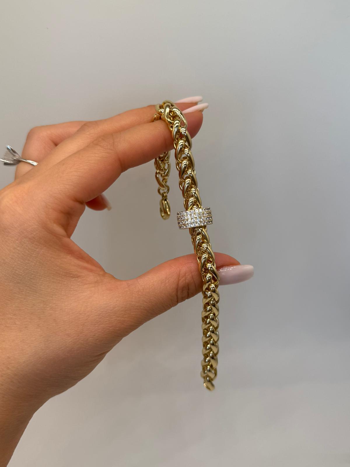 Parlak altın renkli zincir yapısı ile taşlı orta detayın birleşimi, bilekte dikkat çekici ve premium bir stil oluşturur.