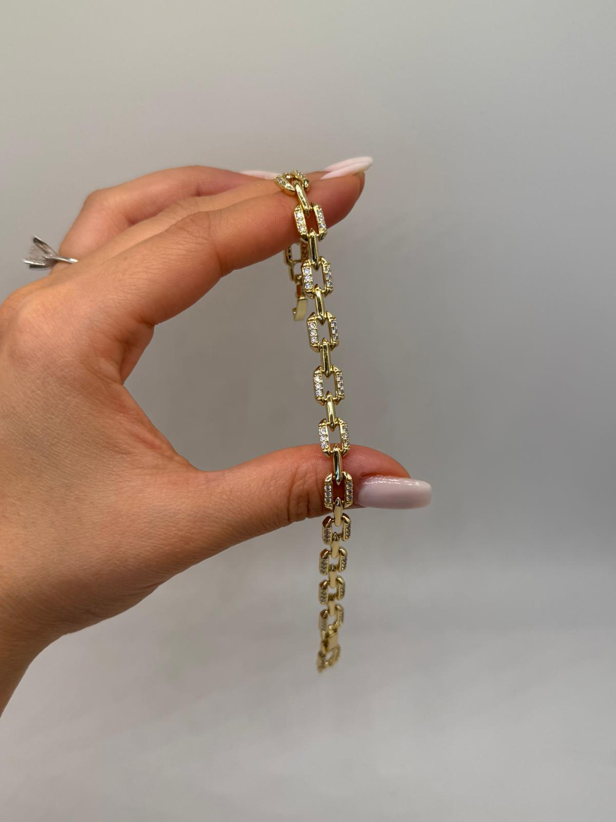 Şık ve güçlü tasarımıyla dikkat çeken Xuping zirkon taşlı zincir bileklik, dikdörtgen formlu halkalar üzerine işlenmiş parlak zirkon taş detaylarıyla modern bir stil sunar.