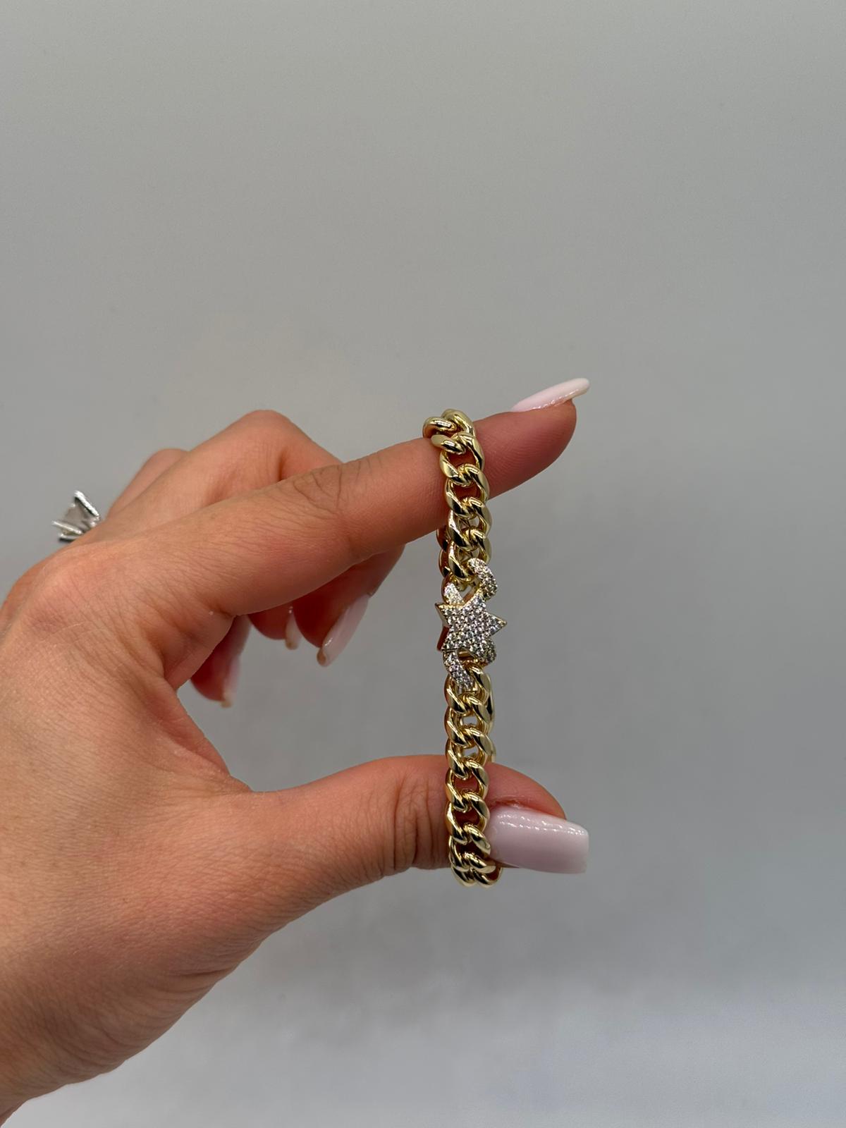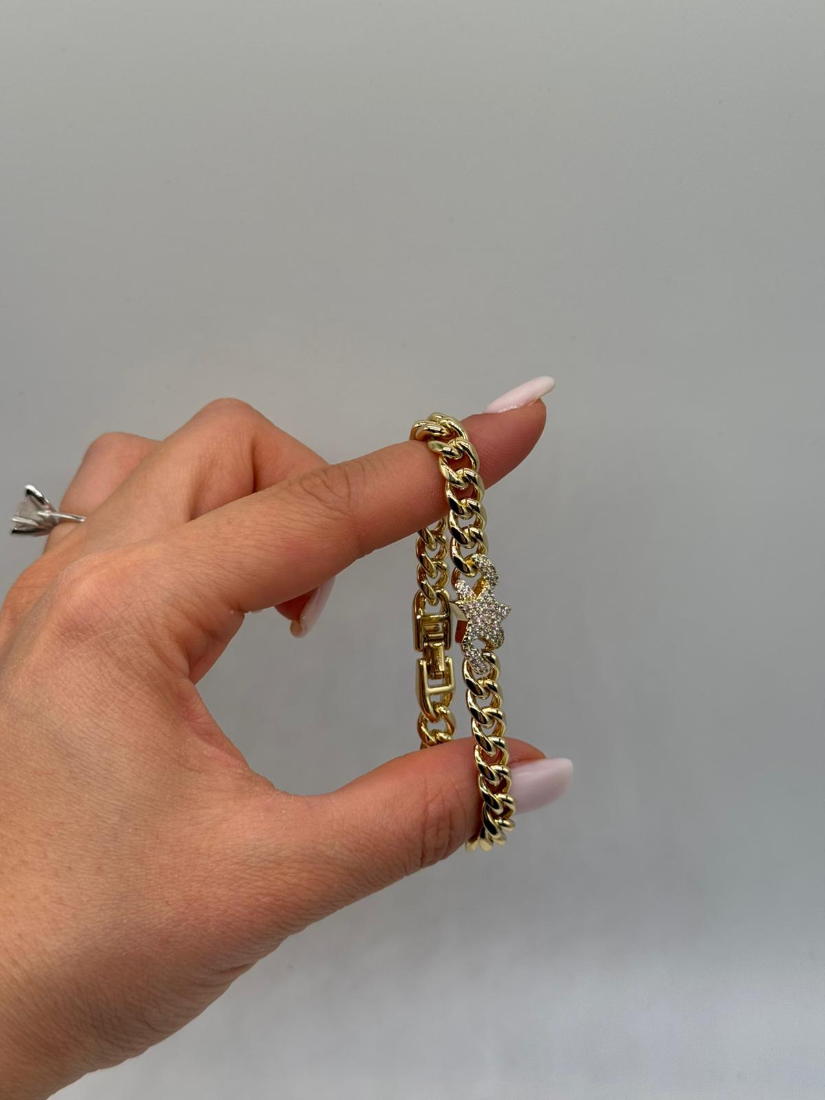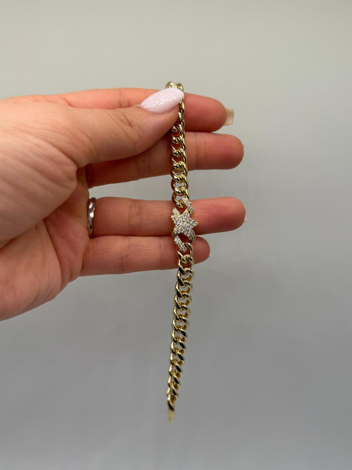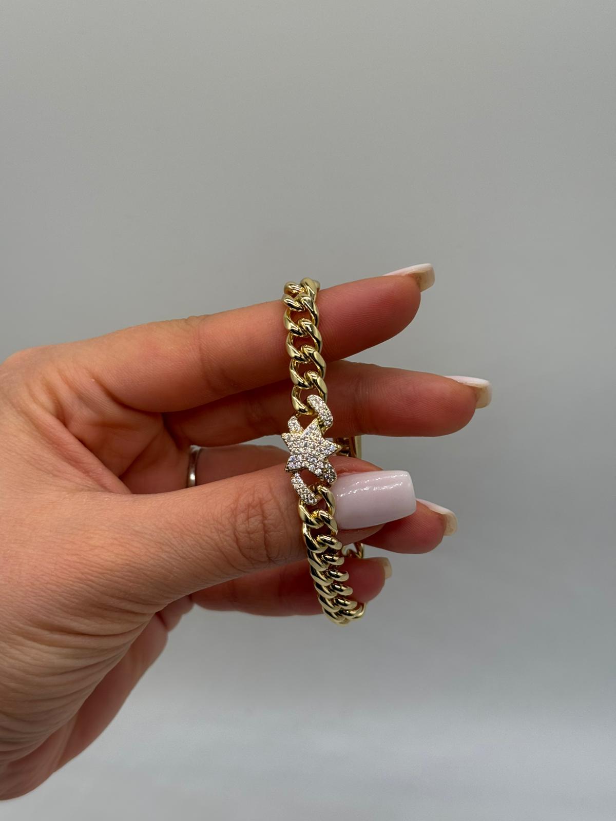 Işıltılı yıldız figürüyle tasarlanan bu bileklik, klasik zincir formuna modern ve dikkat çekici bir dokunuş kazandırır. Orta bölümde yer alan zirkon taşlı yıldız detayı, bilek üzerinde odak noktası oluşturarak şık ve iddialı bir görünüm sunar.
