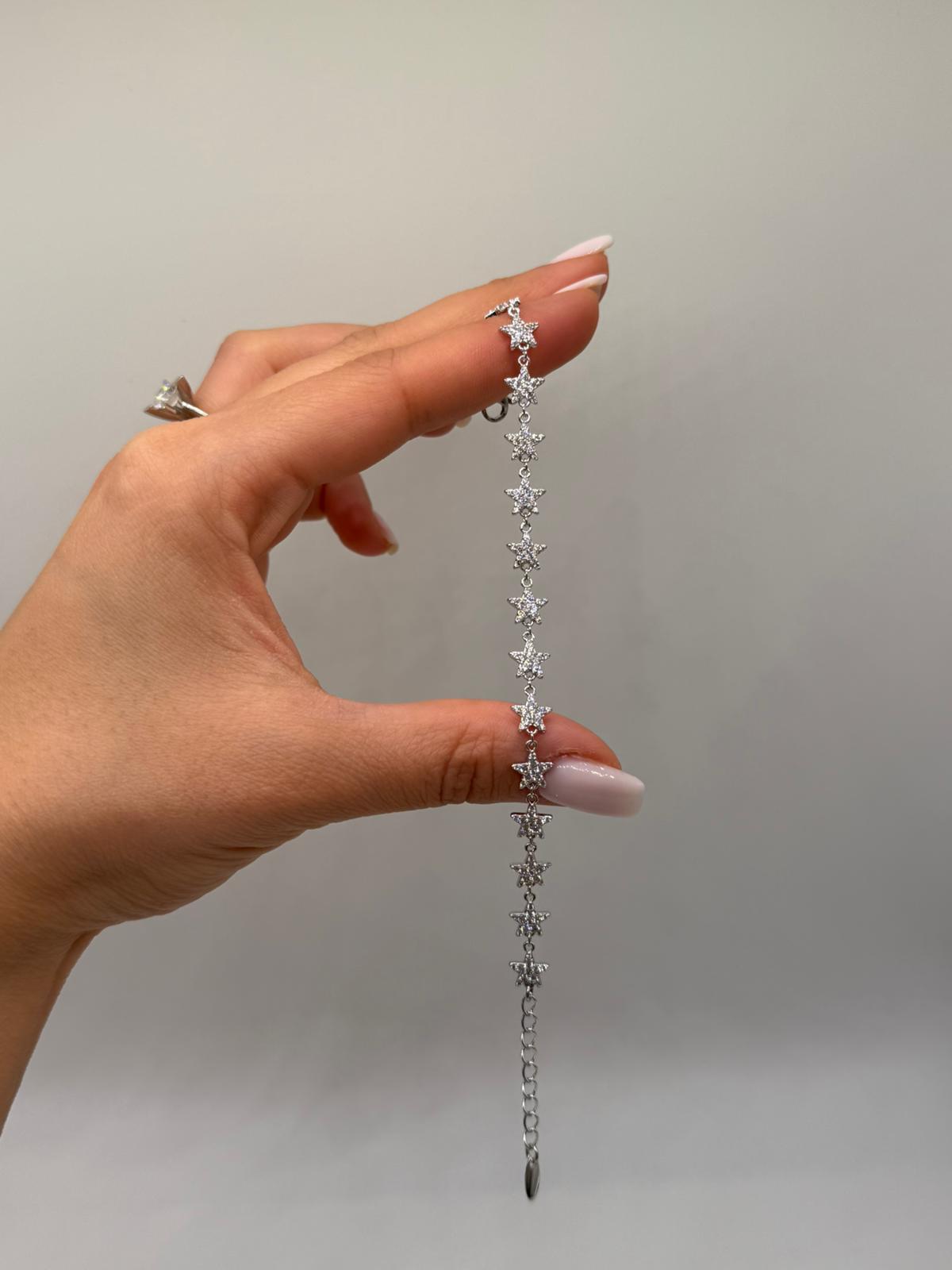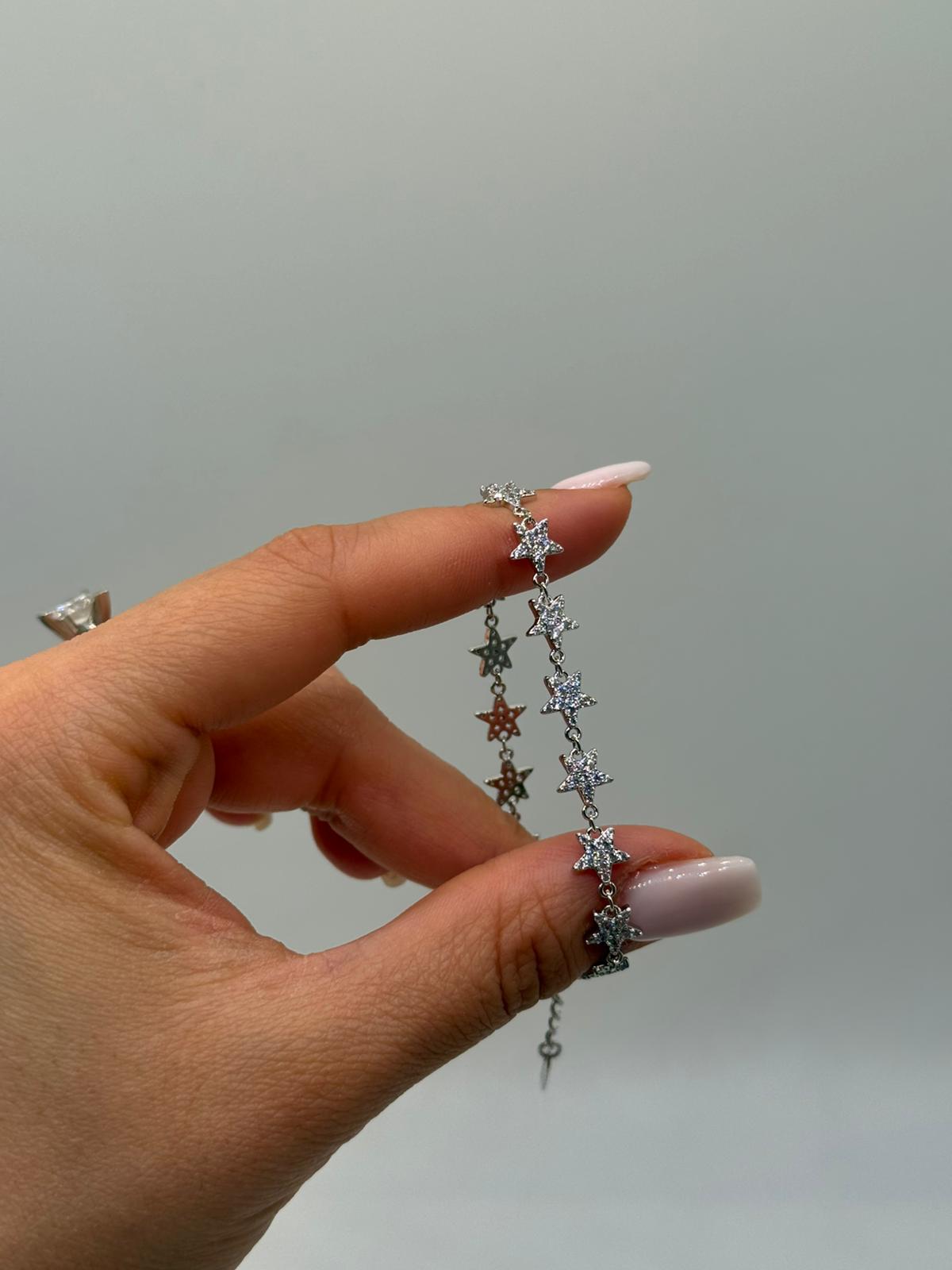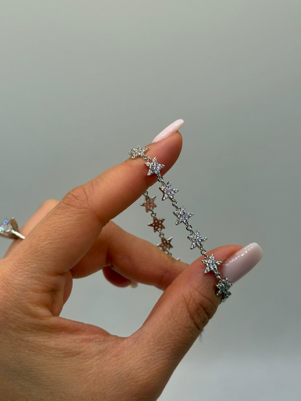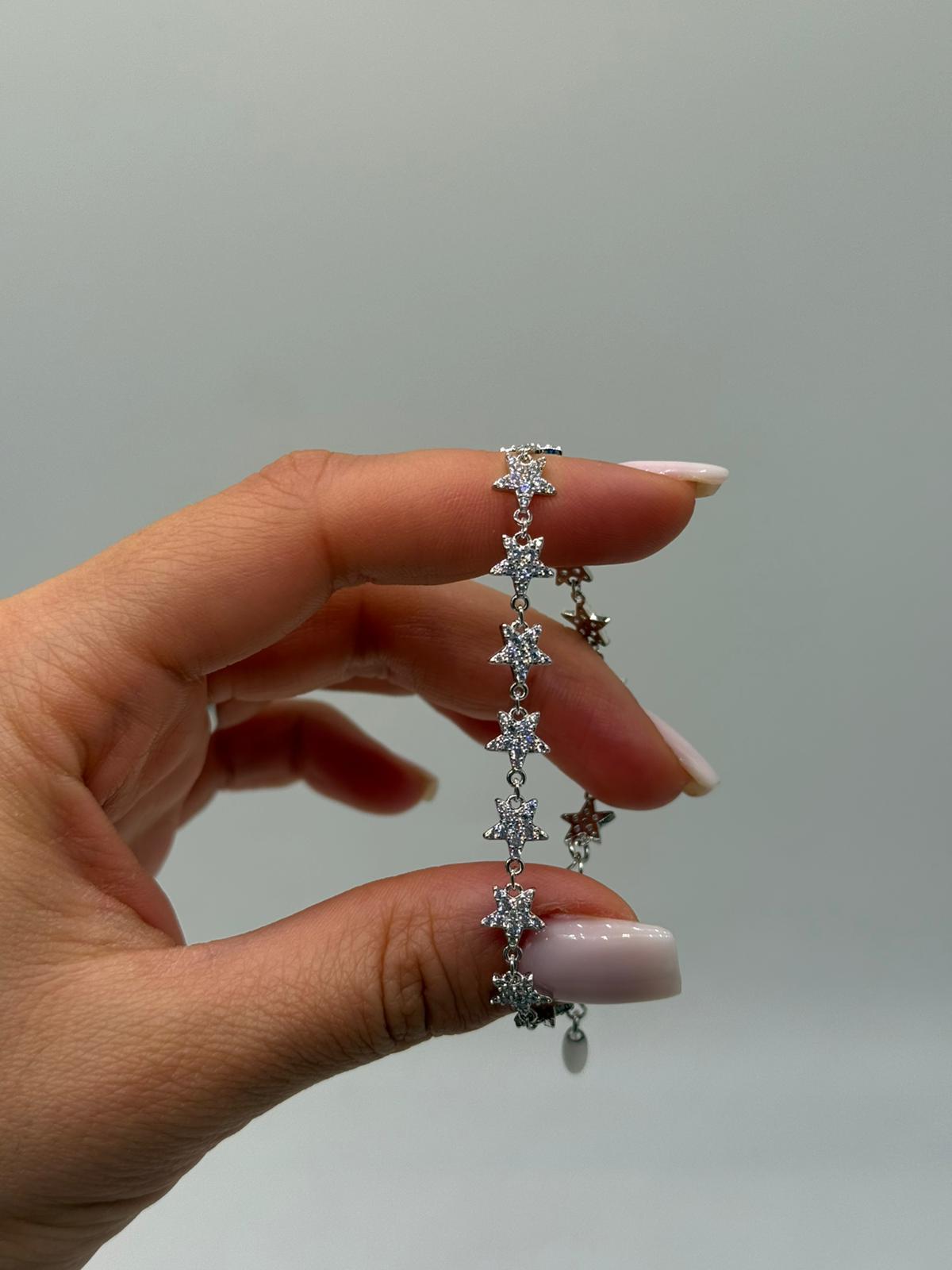 Işıltılı zirkon taşlarla süslenmiş yıldız motifleriyle tasarlanan bu kadın bileklik, feminen ve romantik bir stil sunar. İnce zincir yapısı sayesinde bilekte hafif ve zarif bir duruş oluşturur.