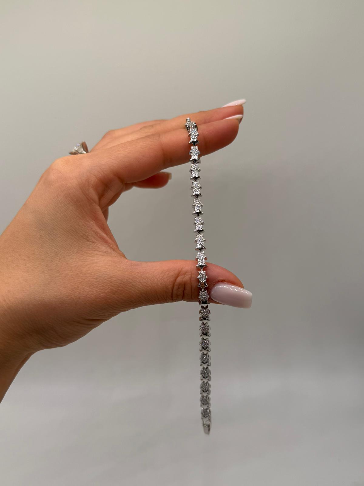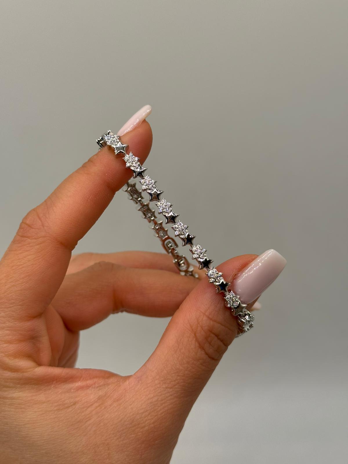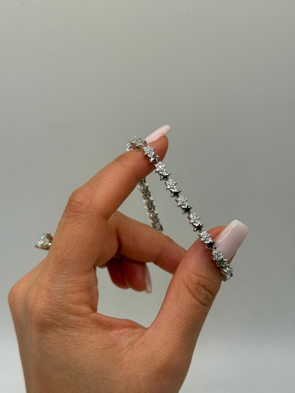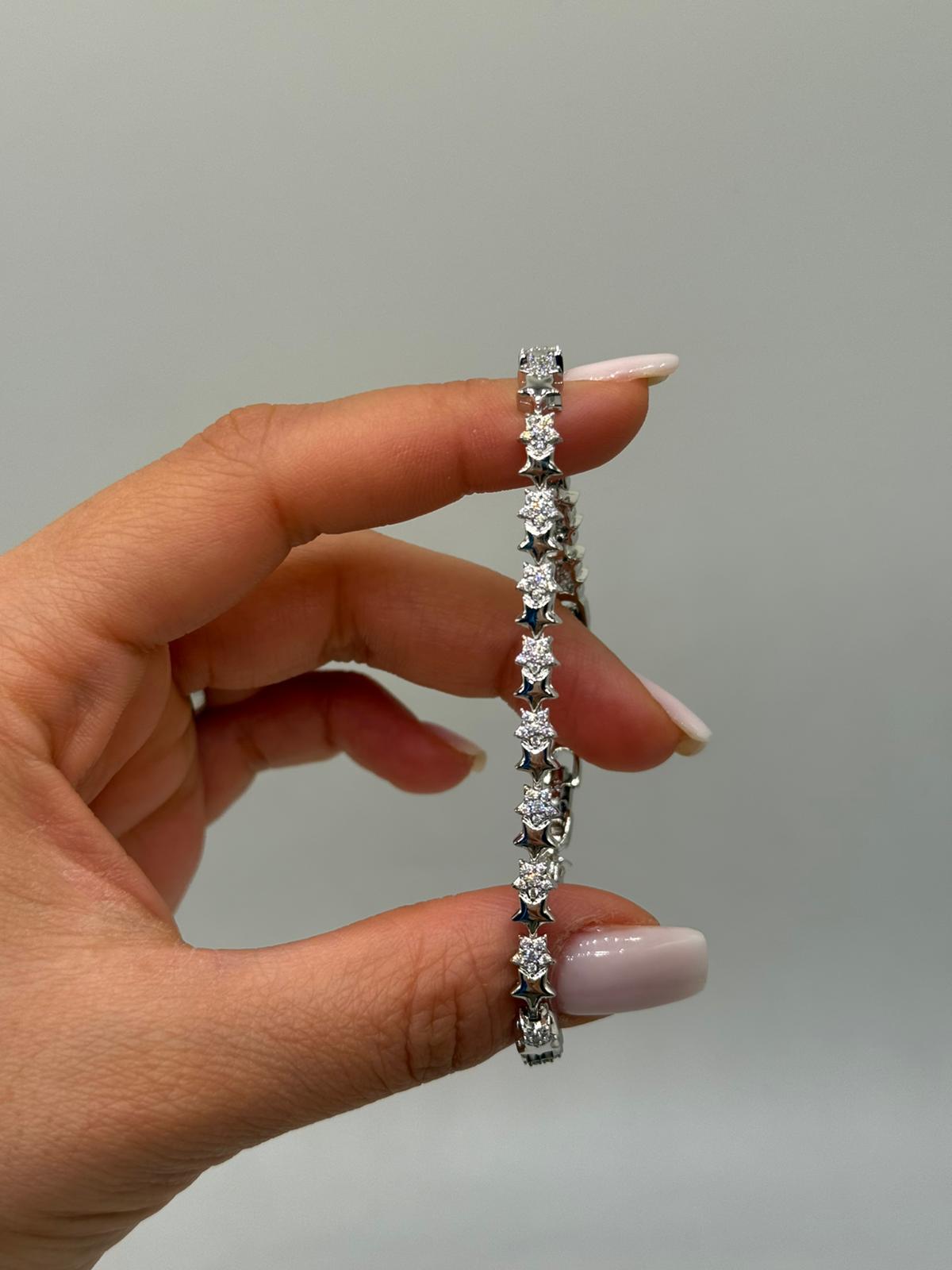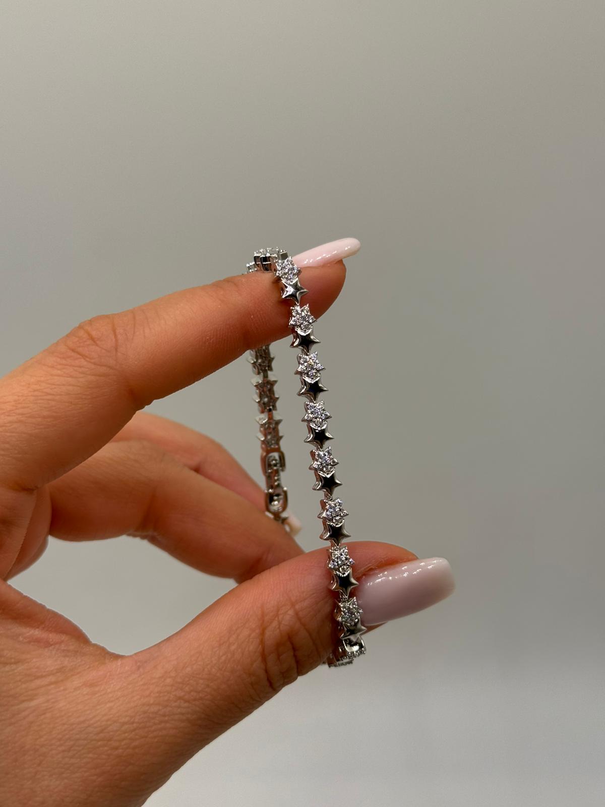 Parlak zirkon taşlarla süslenmiş yıldız motifleriyle tasarlanan bu özel bileklik, minimal ama dikkat çekici bir şıklık sunar. İnce yapısı sayesinde bilekte zarif bir duruş sağlar ve günlük kullanıma son derece uygundur.