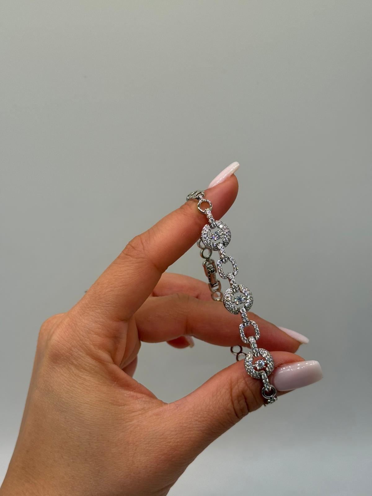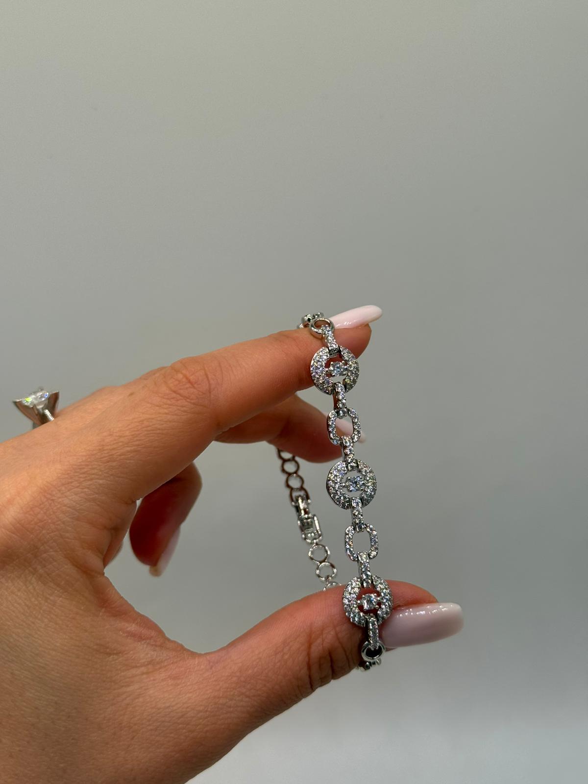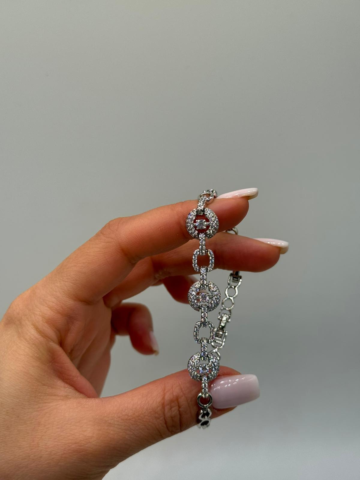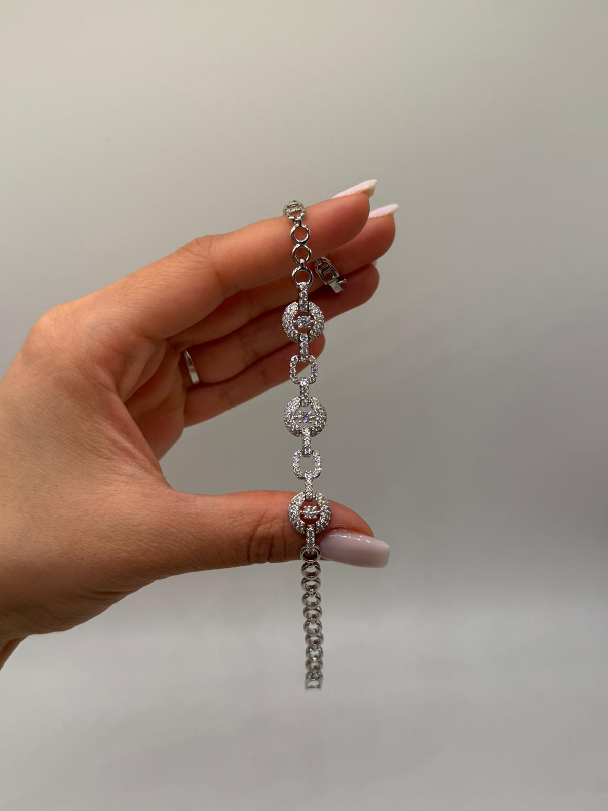Yuvarlak formda tasarlanmış zirkon taşlı detaylarıyla dikkat çeken bu kadın bileklik, modern ve zarif bir görünüm sunar. Simetrik dizilimi sayesinde bilekte dengeli ve şık bir duruş sağlar.