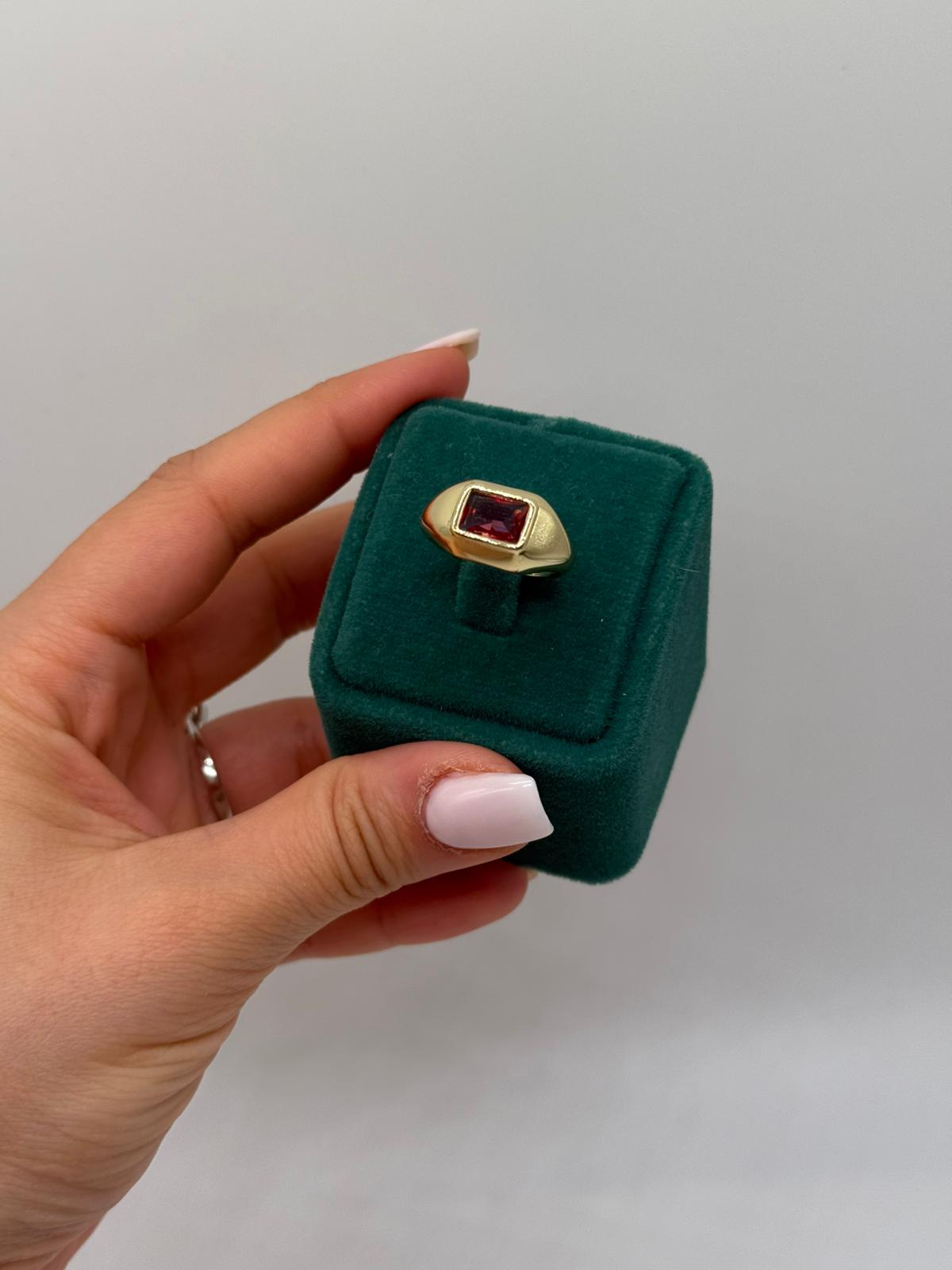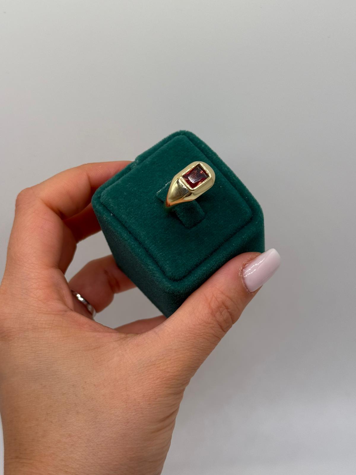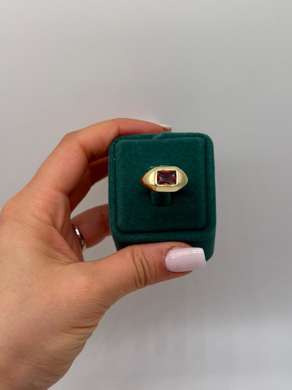Altın renk kaplamalı bu şık yüzük, ortasında yer alan dikdörtgen kesim kırmızı taş detayıyla sade ama etkileyici bir görünüm sunar. Pürüzsüz ve dengeli formu sayesinde parmakta zarif bir duruş sergilerken, klasik çizgileri modern bir stil anlayışıyla buluşturur.