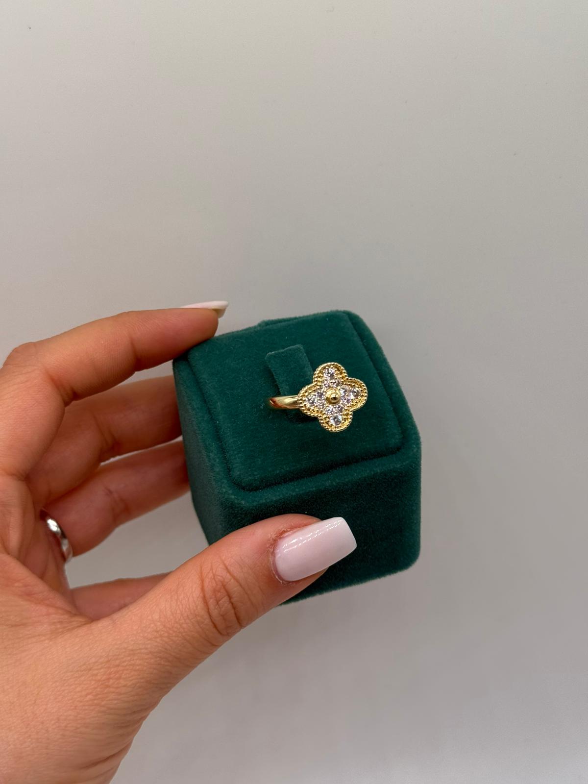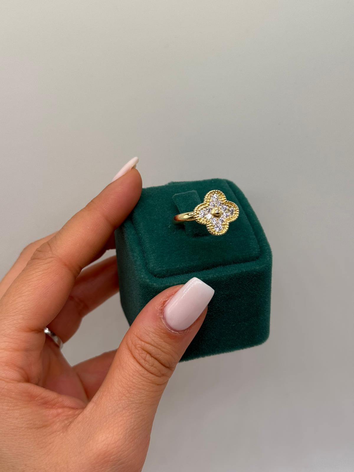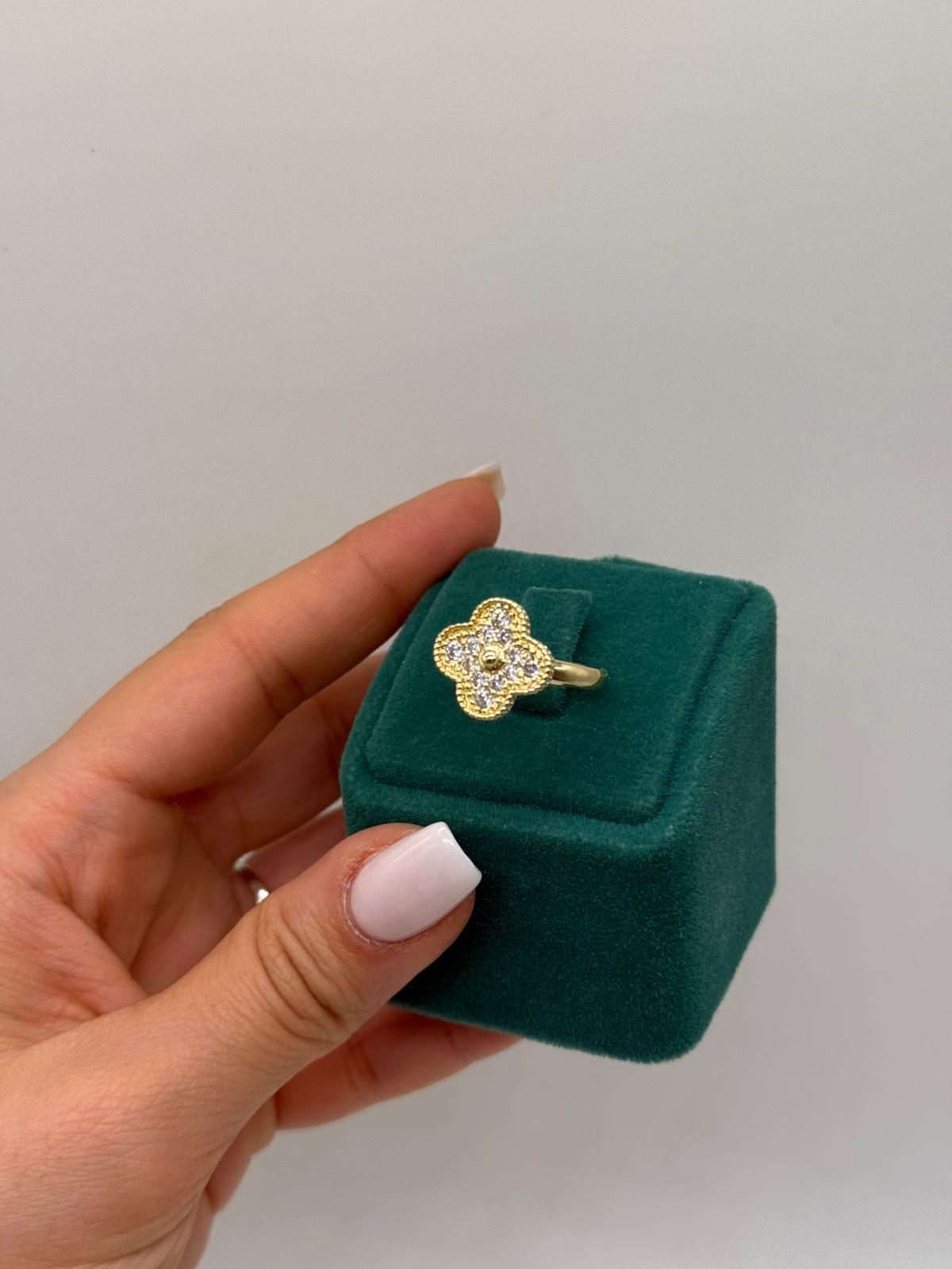 Şans ve zarafeti simgeleyen dört yaprak formu ile tasarlanan bu yüzük, ince işçiliği ve ışıltılı taş detaylarıyla öne çıkar. Altın renk kaplaması sayesinde klasik ve modern tarzı bir arada sunar. Günlük kullanıma uygun olduğu gibi özel kombinlerde de şıklığınızı tamamlayan zarif bir aksesuardır.