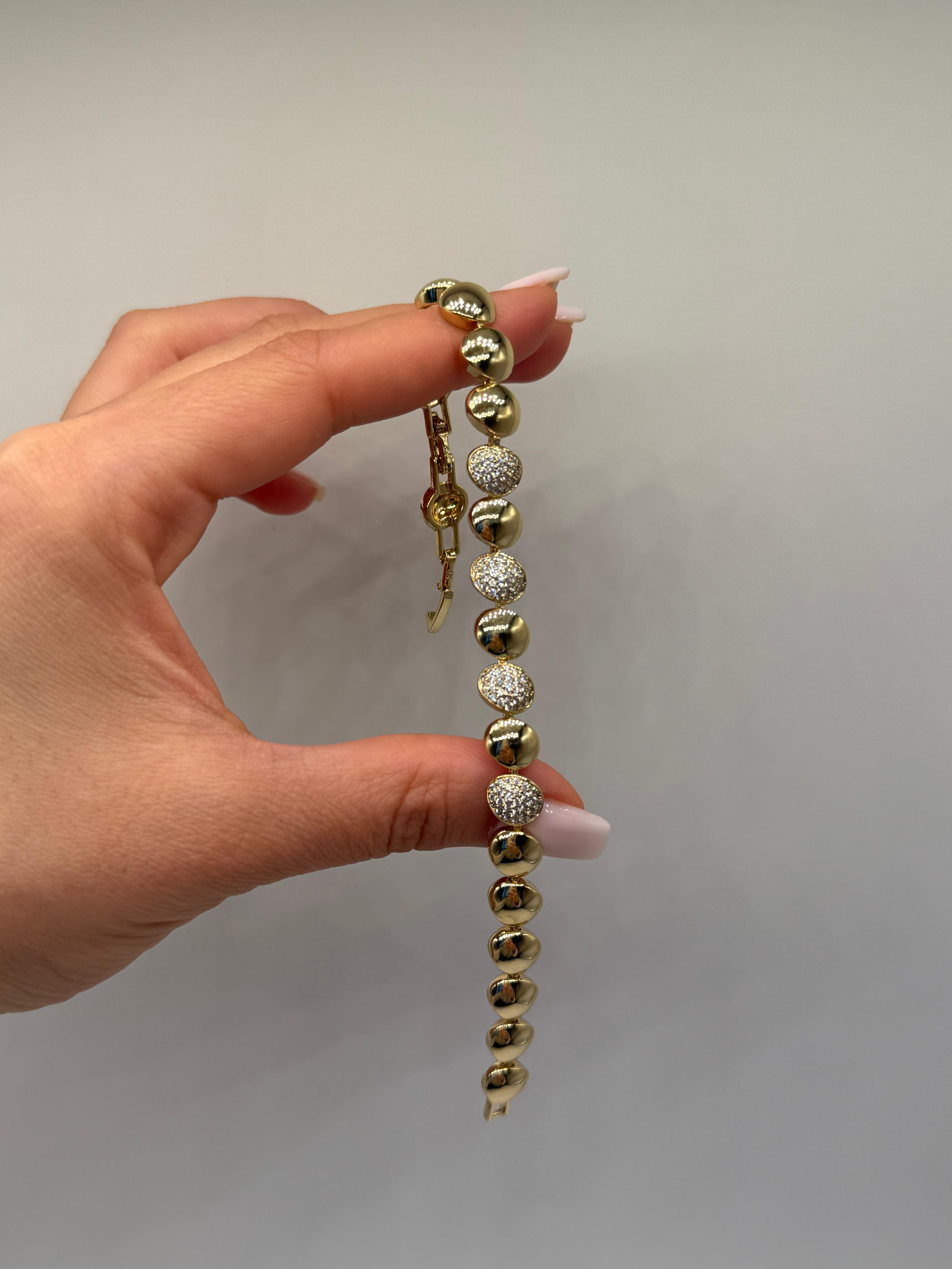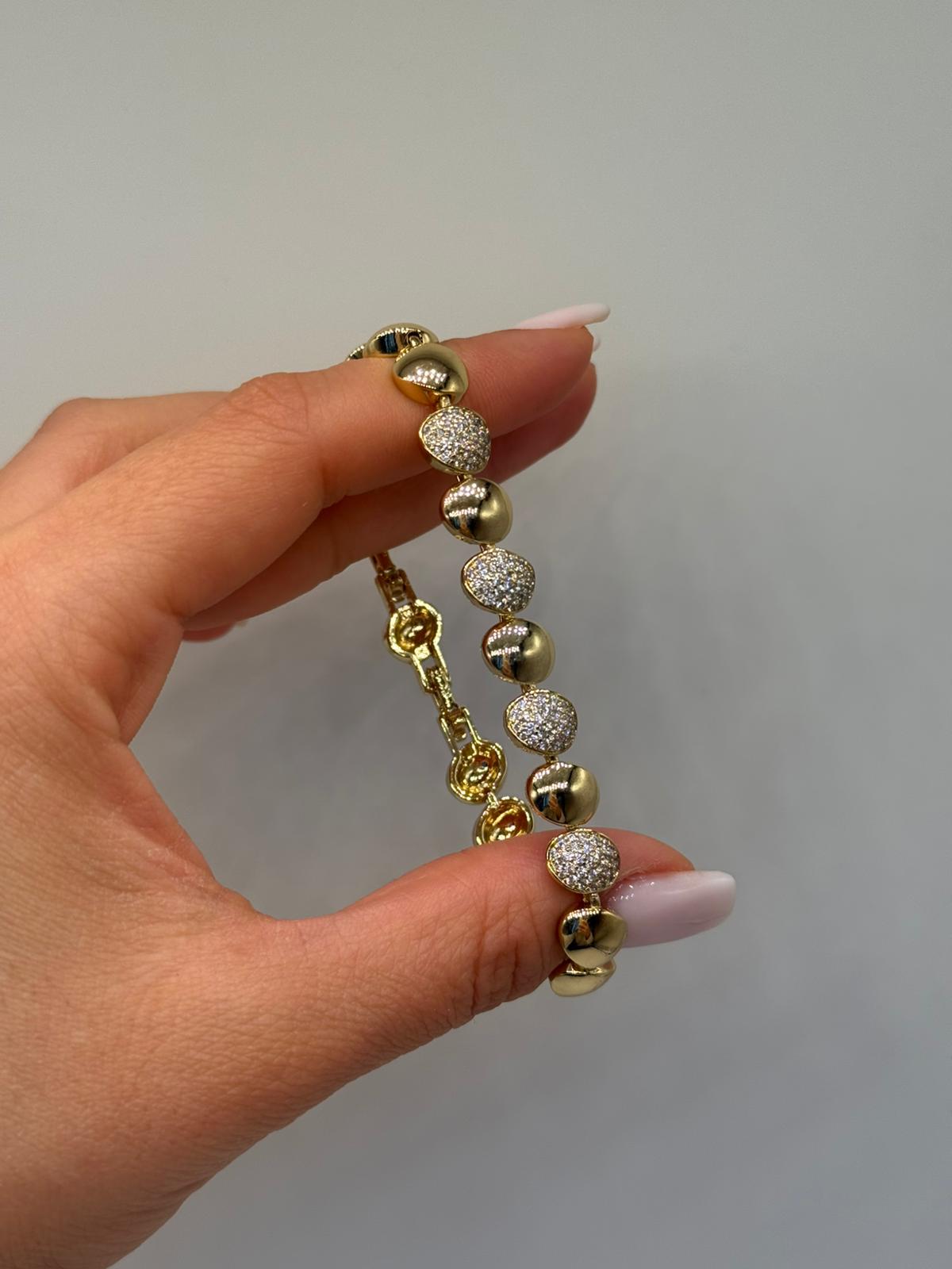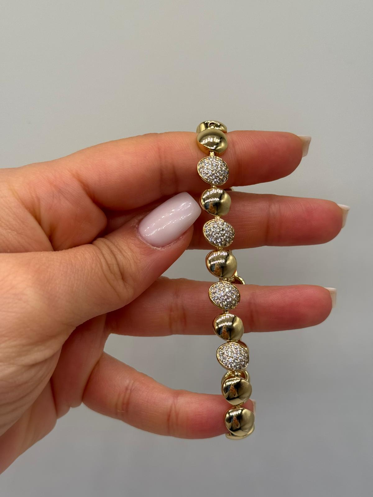 Parlak yüzeyli top detaylar ile zirkon taşlı bölümlerin dönüşümlü kullanımı, tasarıma hareket ve modern bir şıklık kazandırır.