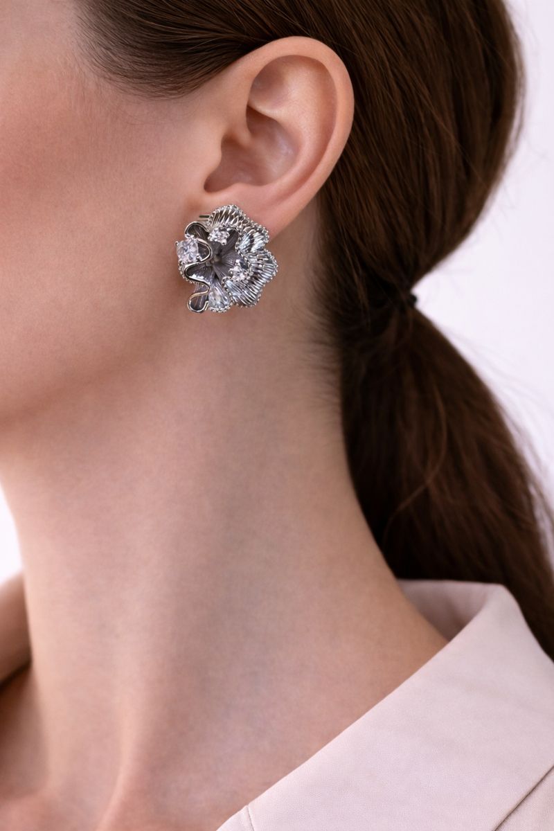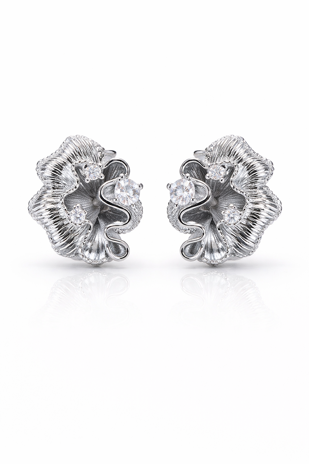 Dalgalı ve dokulu metal form, ortasında yer alan zirkon taş ile birleşerek küpeye zarif bir hareket kazandırır. Gümüş renk yüzeyi ışığı yumuşak şekilde yansıtırken, zirkon taş detayı tasarıma sofistike bir parlaklık katar.