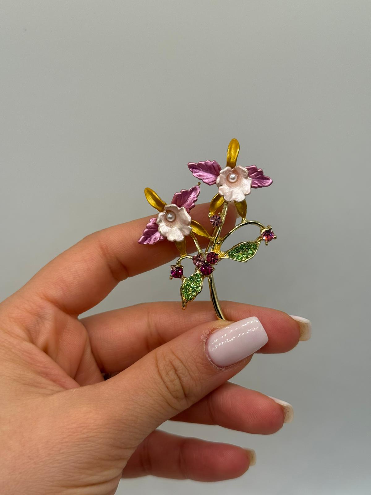 Merkezde yer alan inci görünümlü detaylar ve renkli mine yapraklar, broşa feminen ve sofistike bir hava kazandırır. Dayanıklı metal gövdesi ve kaliteli kaplaması sayesinde uzun süre parlaklığını ve formunu korur.