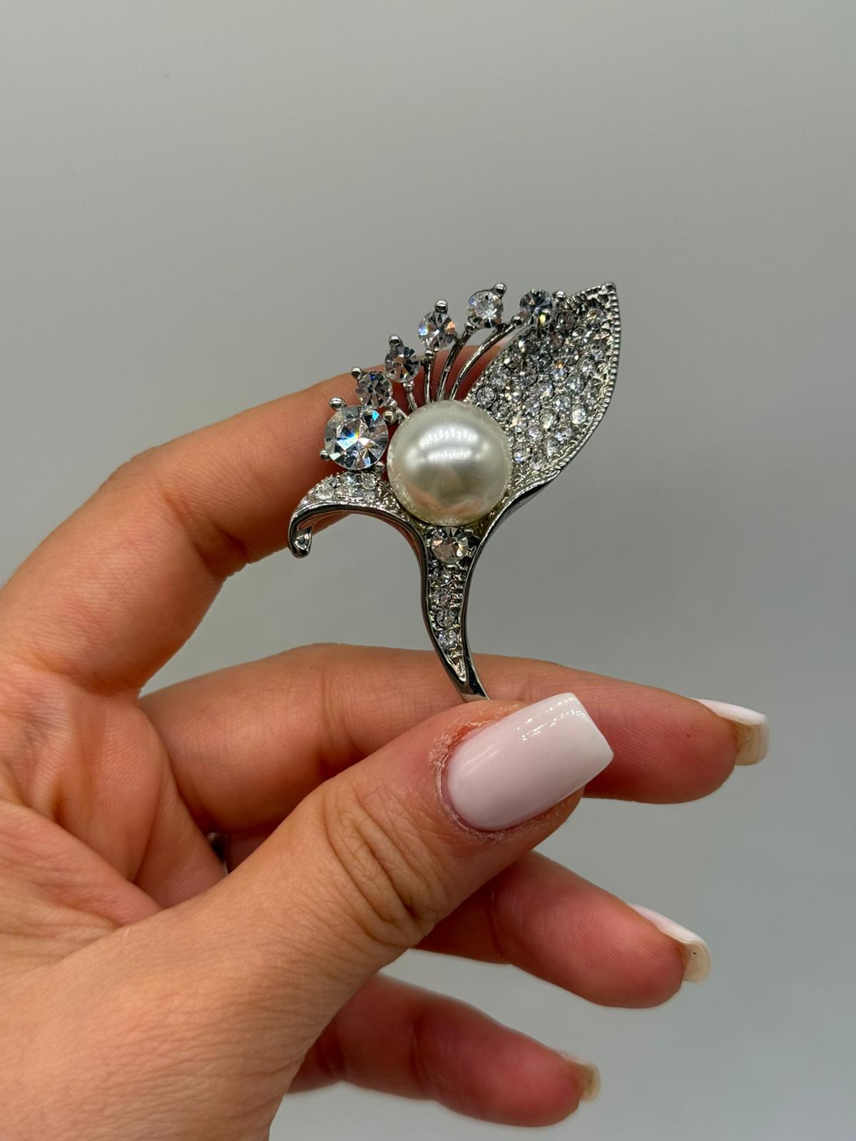 Doğadan ilham alan yaprak formu ve merkezde yer alan inci detayıyla öne çıkan bu şık broş, zarif çizgileri ve ışıltılı zirkon taşlarıyla sofistike bir görünüm sunar. Akıcı tasarımı sayesinde hem klasik hem modern kombinlerle mükemmel uyum sağlar.