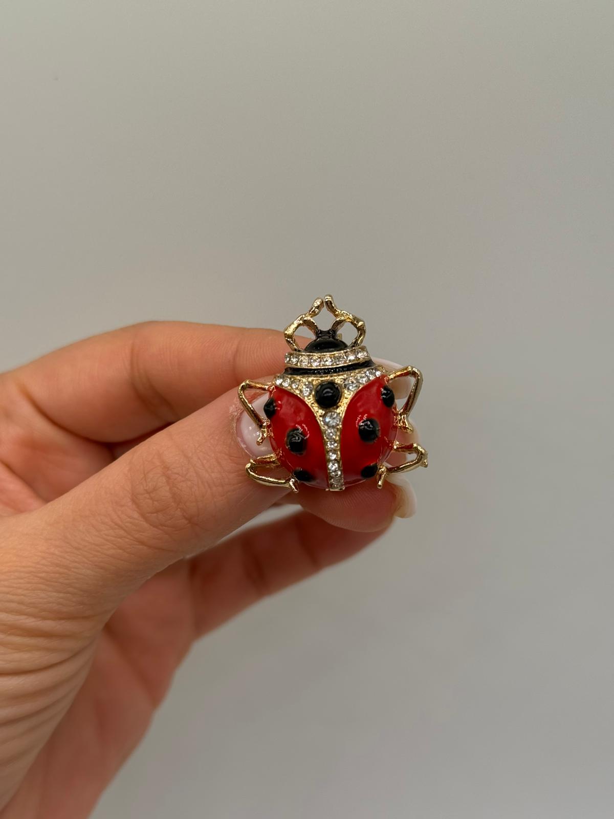 Şans ve zarafetin simgesi uğur böceğinden ilham alan bu özel tasarım broş, taç detayıyla göz alıcı bir şıklık sunar. Parlak kırmızı mine yüzeyi ve altın tonlu metal gövdesiyle dikkat çeken ürün, merkezinde ve detaylarında kullanılan yüksek kalite zirkon taşlar ile zenginleştirilmiştir.