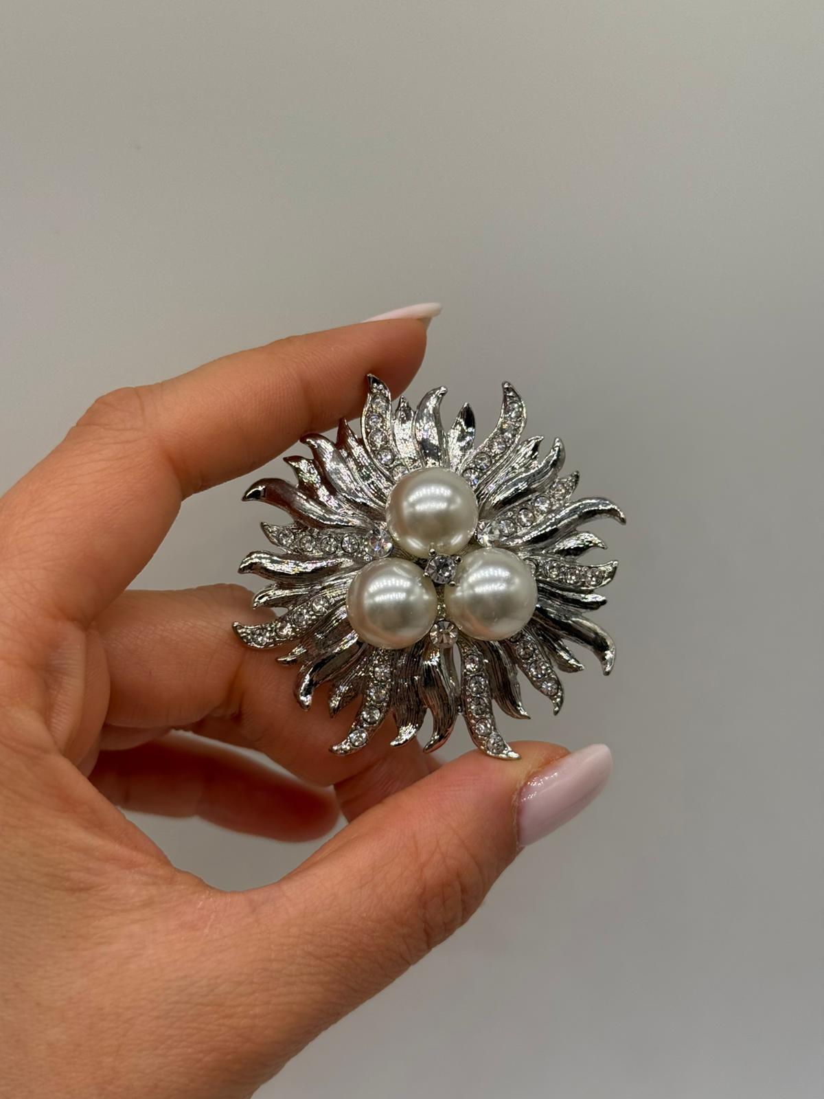 Merkezinde yer alan üçlü inci detayı ve etrafını saran ışın formundaki zirkon taşlı yapraklarıyla tasarlanan bu özel broş, göz alıcı ve sofistike bir görünüm sunar. Dinamik çiçek formu, broşa hareketli bir ışıltı kazandırırken inci detayları tasarımı zarif bir dengeyle tamamlar.